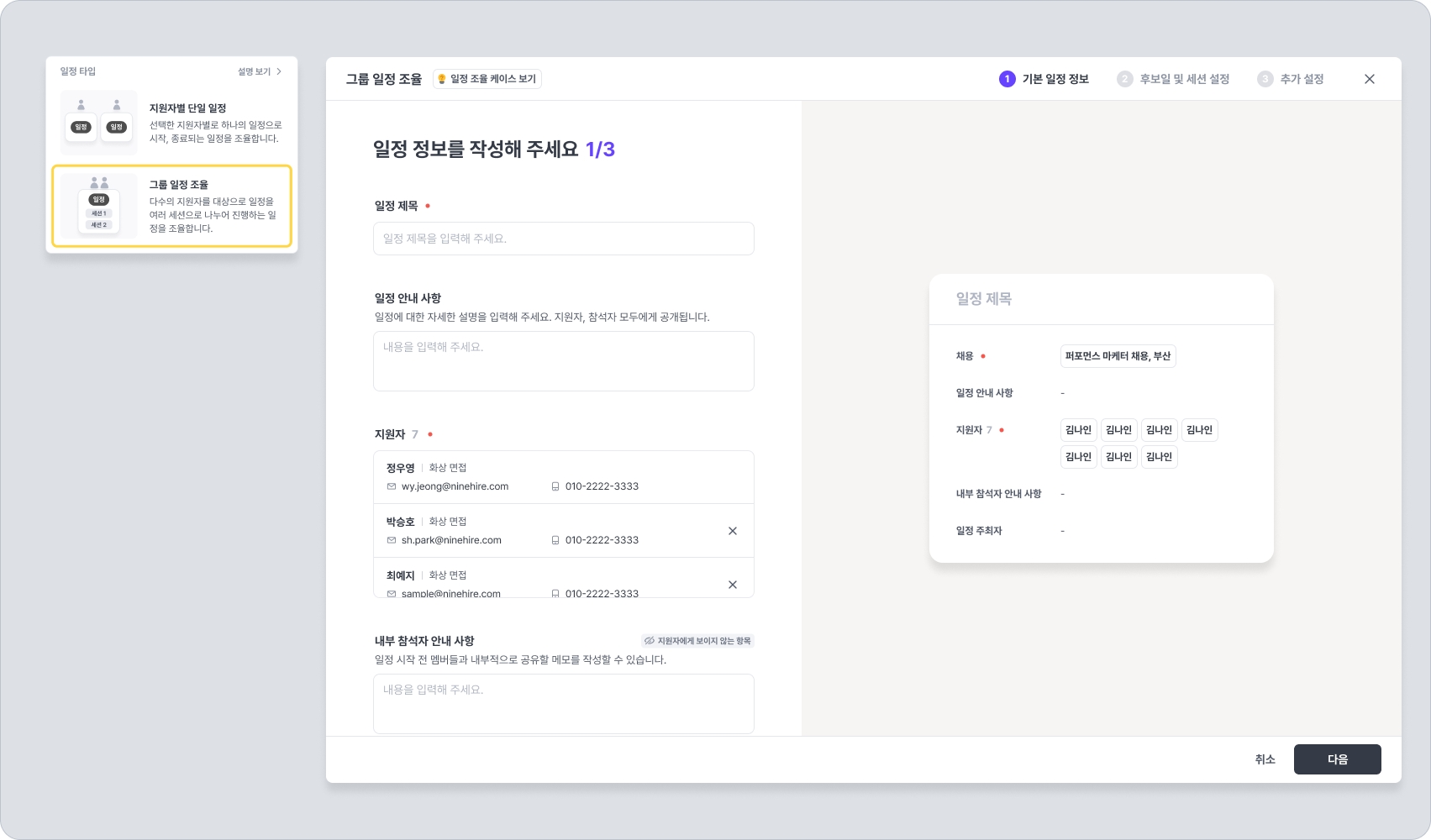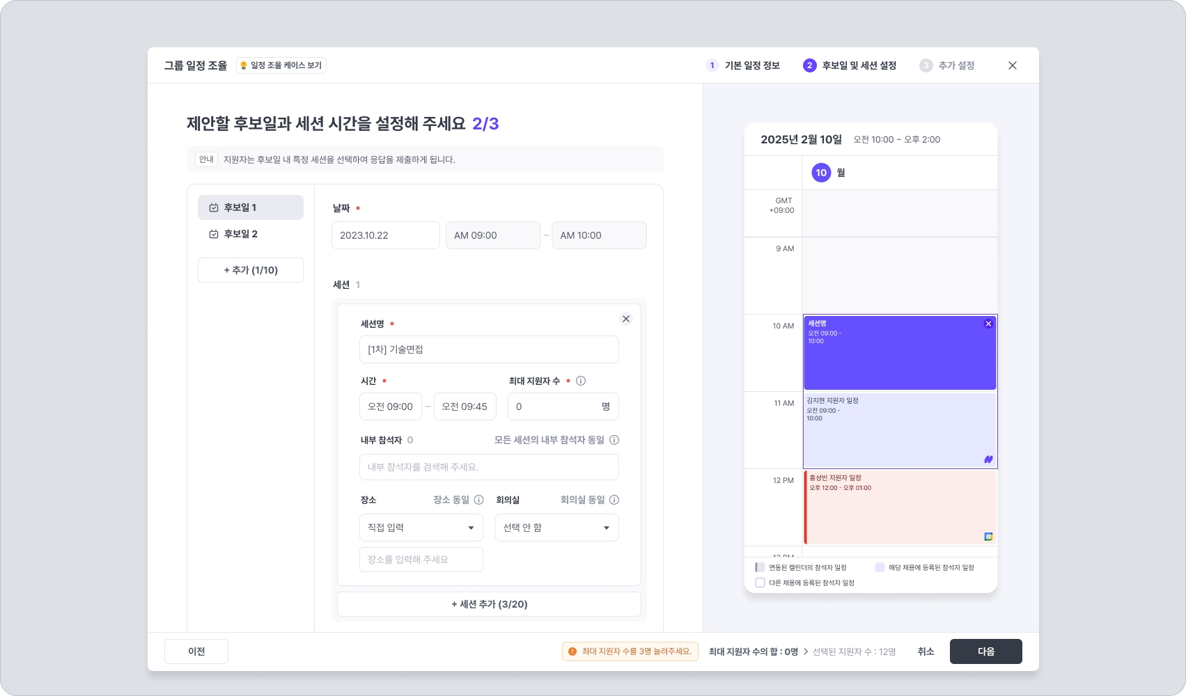 여러 명의 지원자를 대상으로 하나의 일정 내 여러 세션 일정이 존재하는 그룹 일정을 조율합니다.