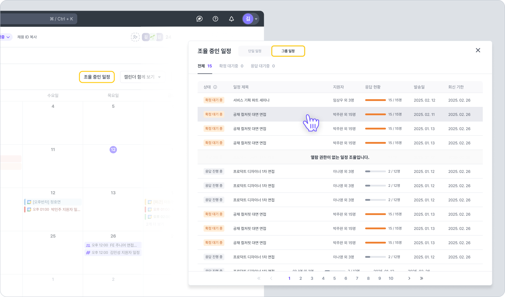 각 채용 > 채용 캘린더 > 조율 중인 일정 버튼 클릭 시