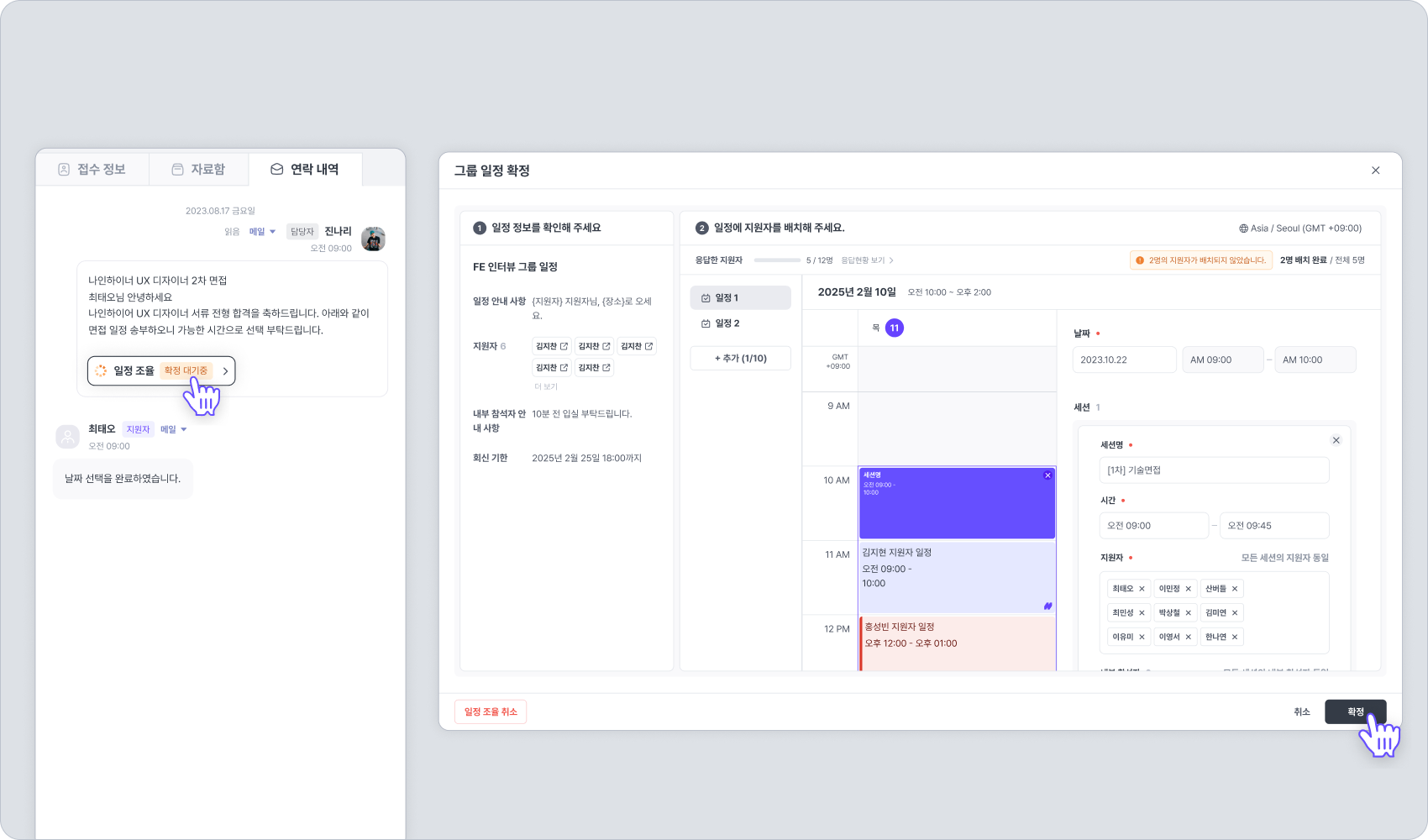 일정 확정 모달에서는 지원자가 제출한 응답을 기준으로 세션별 지원자가 자동 배치됩니다.