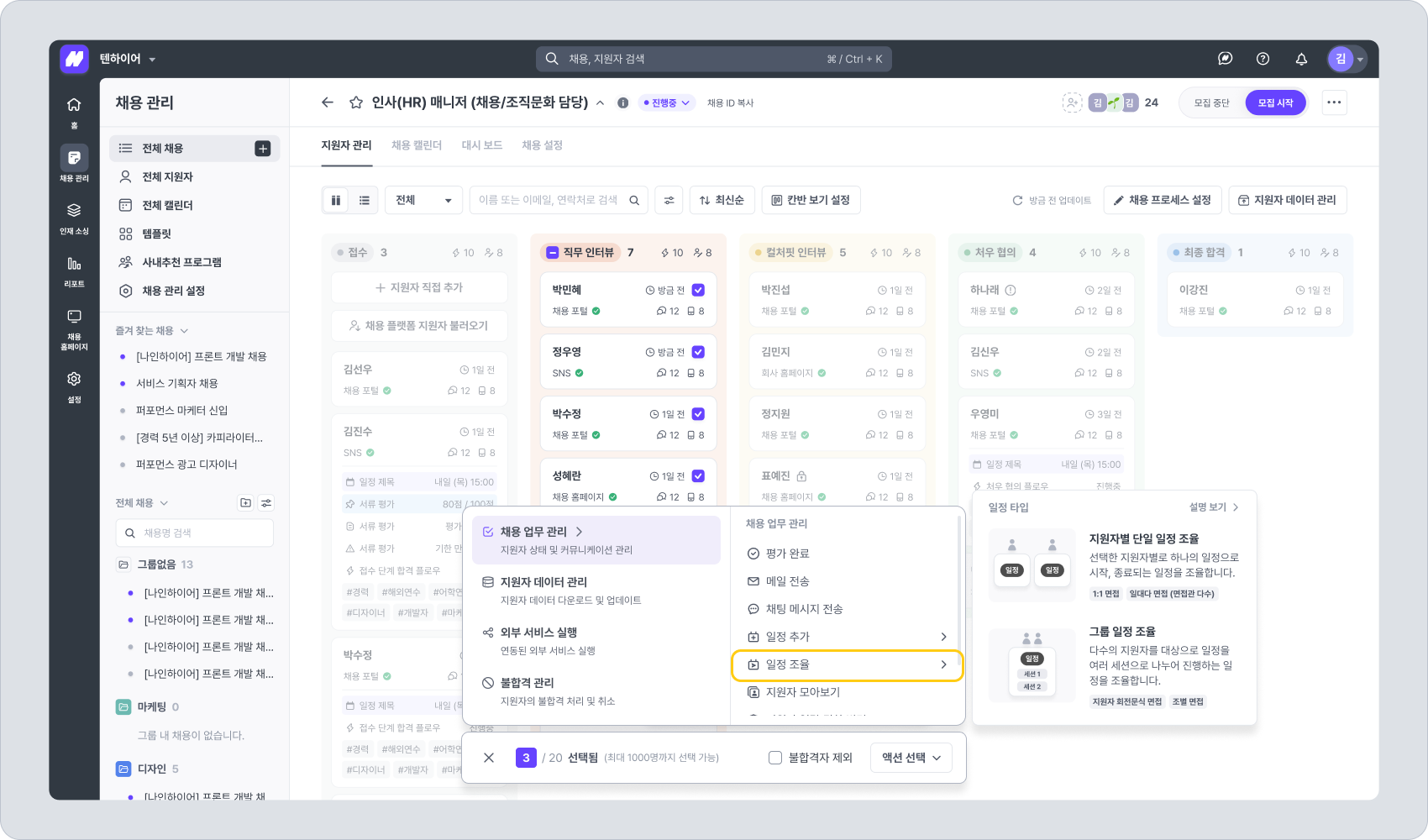 경로: 지원자 관리 탭에서 지원자 다중 선택 > 하단 액션 바 > 일정 만들기 > 일정 조율 > 그룹 일정 조율