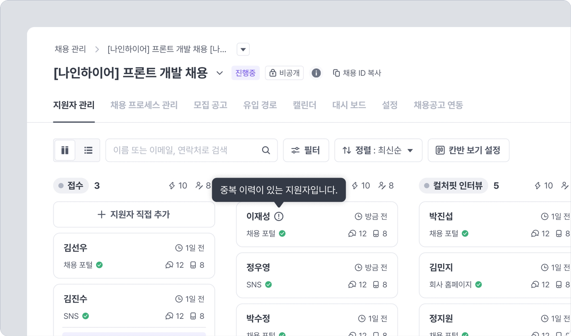 지원자 관리 탭 칸반 보드 뷰에서 칸반에 표시되는 "느낌표" 표시는 중복 이력이 있는 지원자임을 의미합니다.