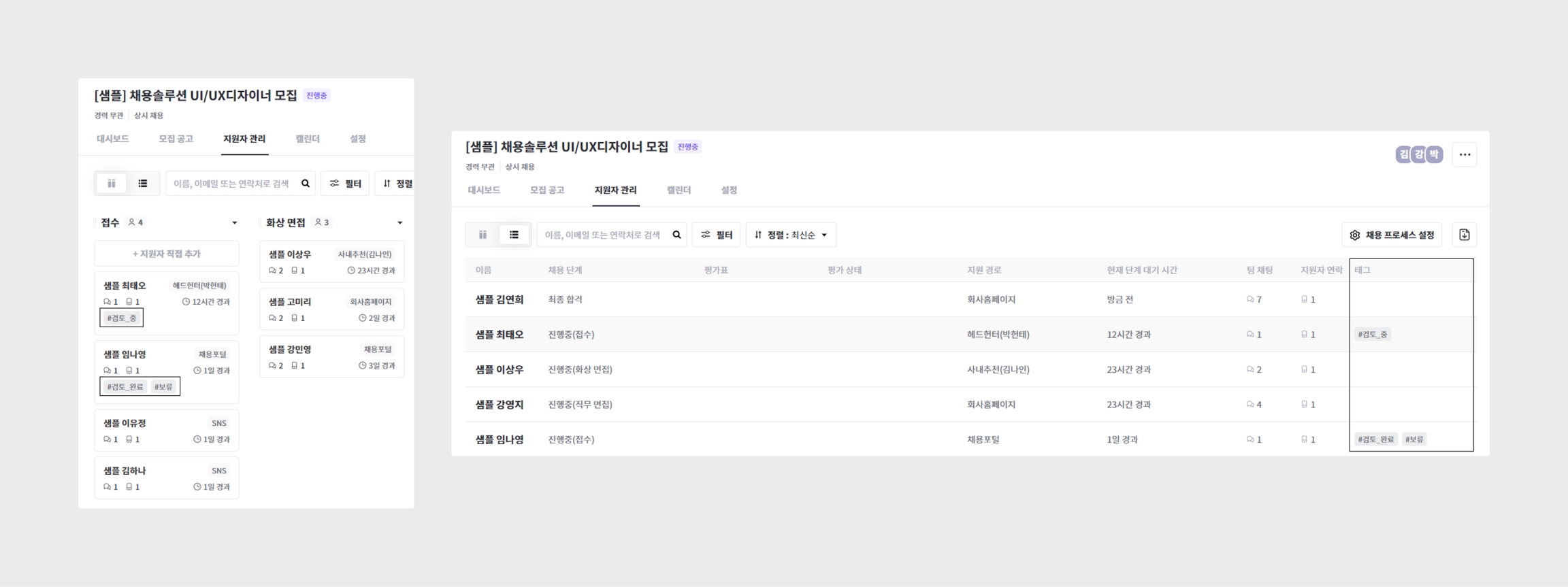 지원자 관리 탭에서는 태그를 필터 조건으로 활용할 수 있습니다.