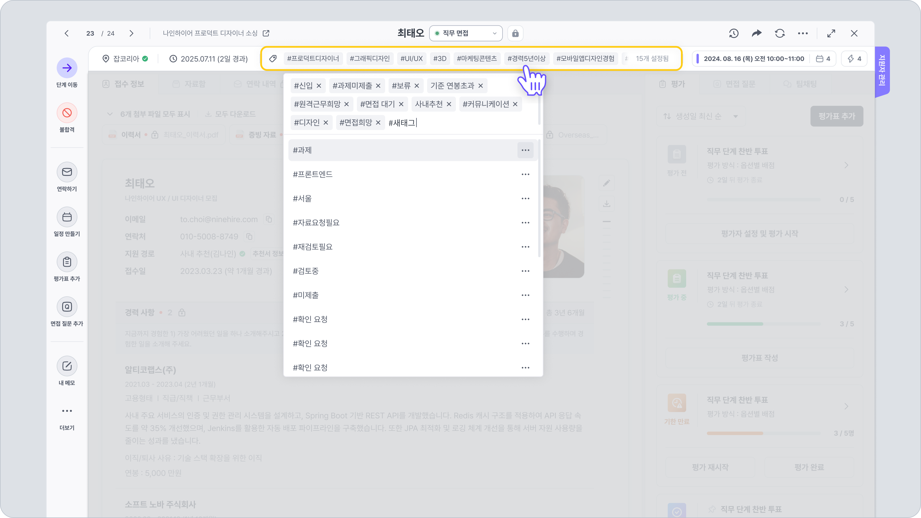 지원자 상세 화면을 열었을 때 상단 태그 항목을 통해 지원자에게 추가되어 있는 태그를 확인할 수 있습니다.