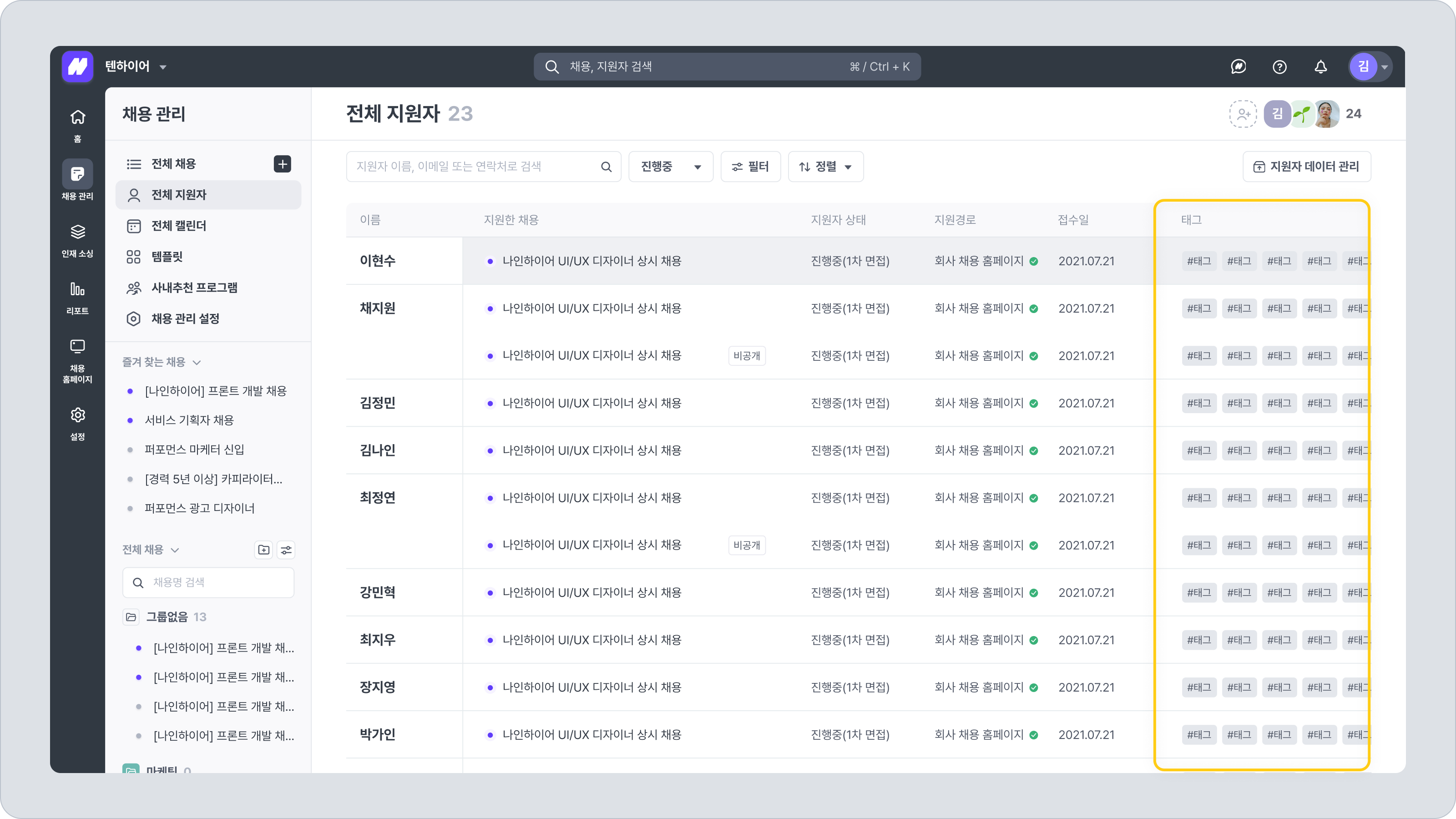 전체 지원자 페이지에서는 태그 항목으로 지원자 태그가 보여집니다.