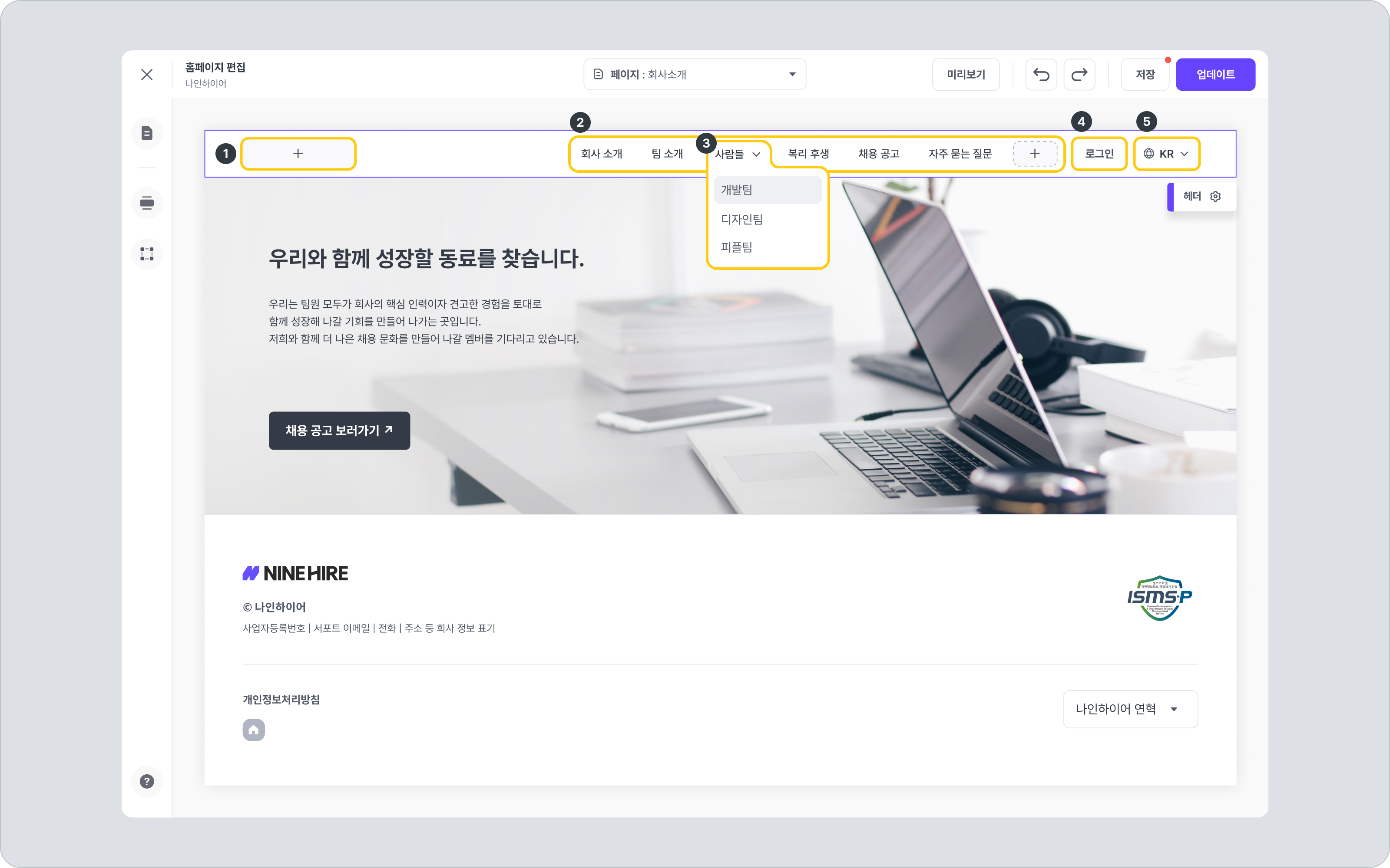 ④ 메뉴 버튼 - 개인정보 처리방침, 문의하기 등 페이지 이동 링크 버튼 (추가/삭제 가능, 최대 10개) ⑤ SNS 버튼 - 홈페이지, 블로그, 인스타그램 등 소셜 미디어 링크 아이콘 (추가/삭제 가능, 최대 10개)