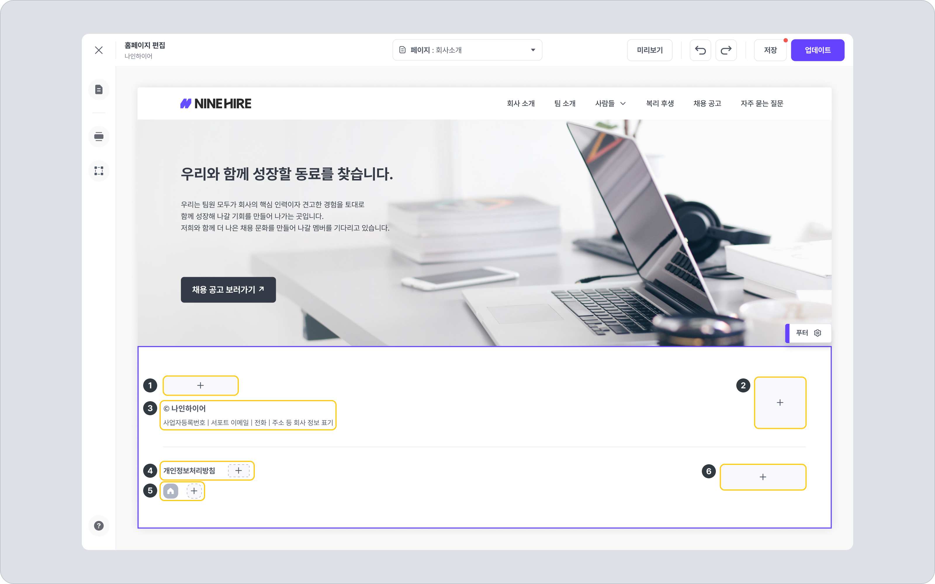 푸터는 아래 ①~⑥ 요소로 구성됩니다. 각 요소는 푸터 영역 선택 후 우측 푸터 설정 패널에서 표시 여부를 선택할 수 있습니다.