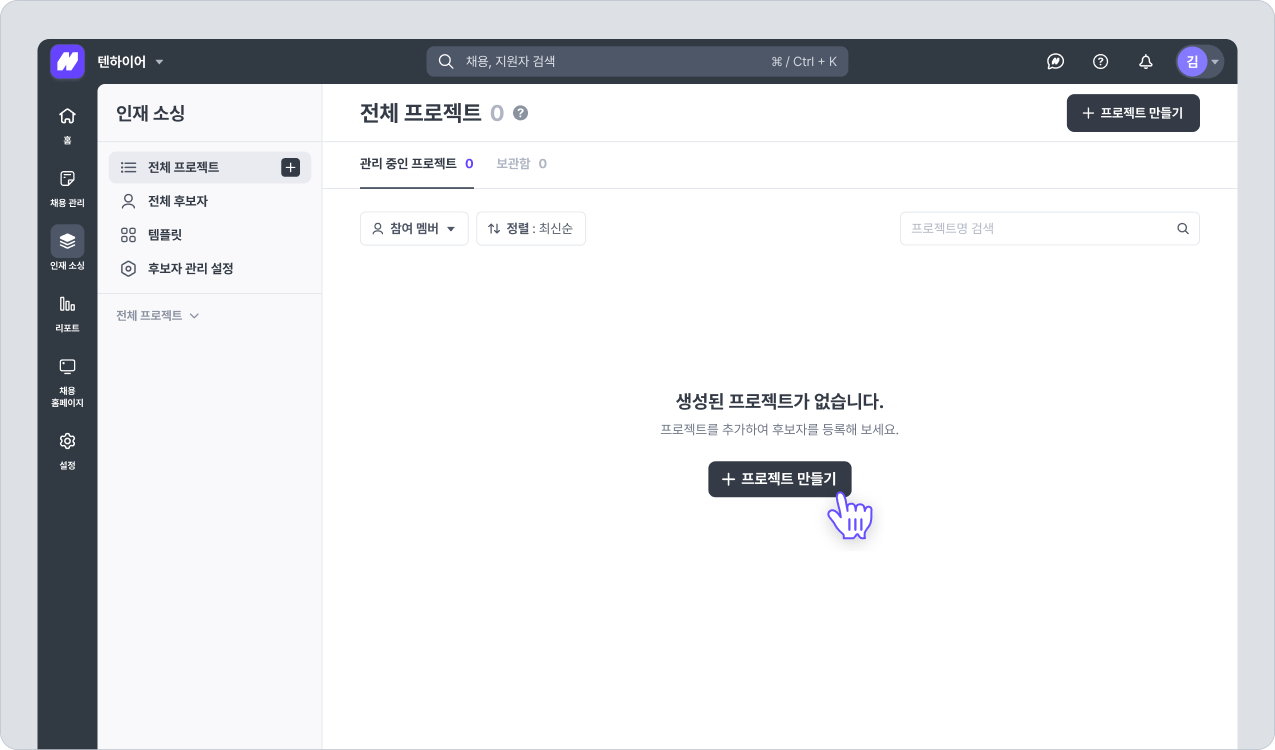 인재 소싱 > 전체 프로젝트 탭의 오른쪽에 위치한 + 버튼이나 전체 프로젝트 우측 상단에 위치한 프로젝트 만들기 버튼을 클릭하여 새로운 프로젝트를 만들 수 있습니다.