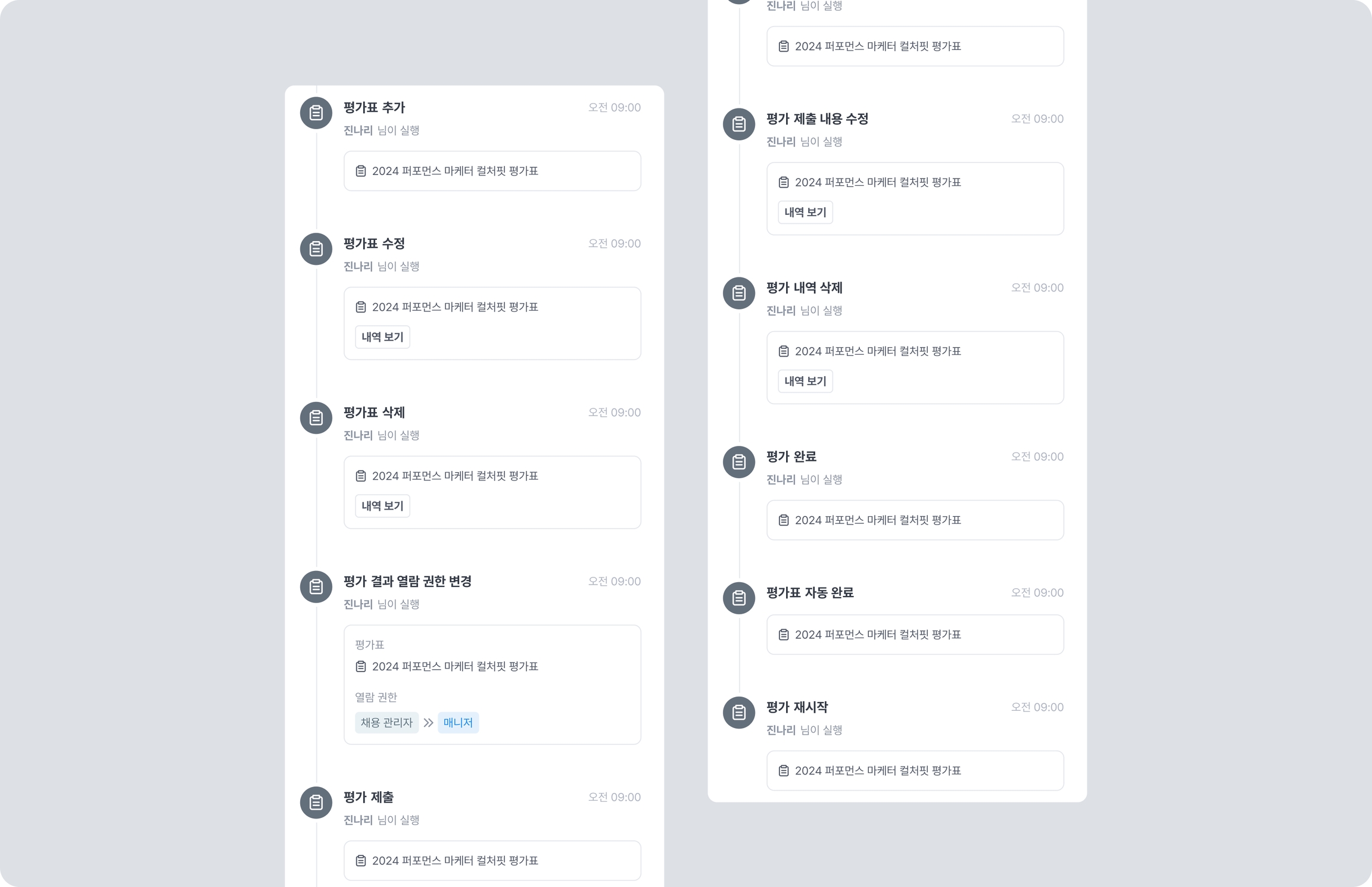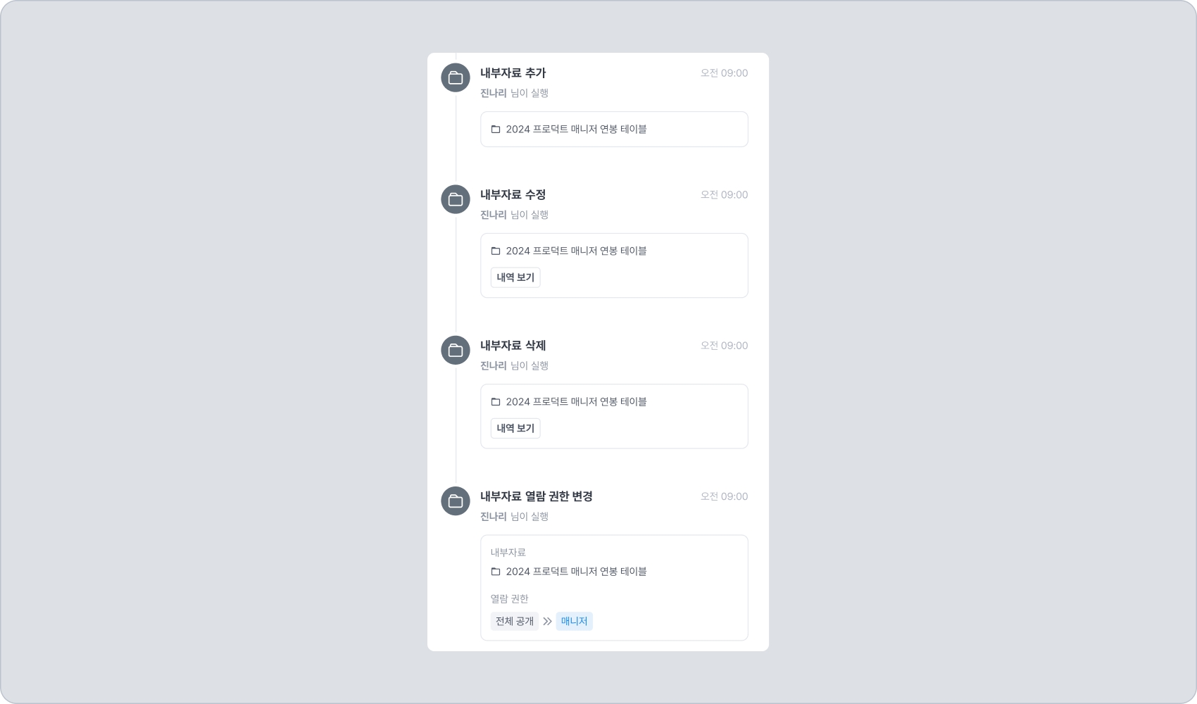 활동 내역 탭에 기록되는 항목의 분류 및 상세 종류는 아래와 같습니다.
