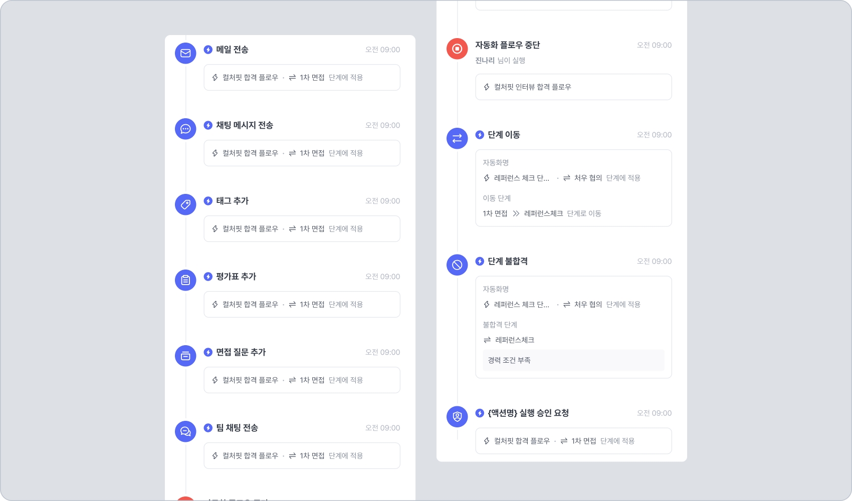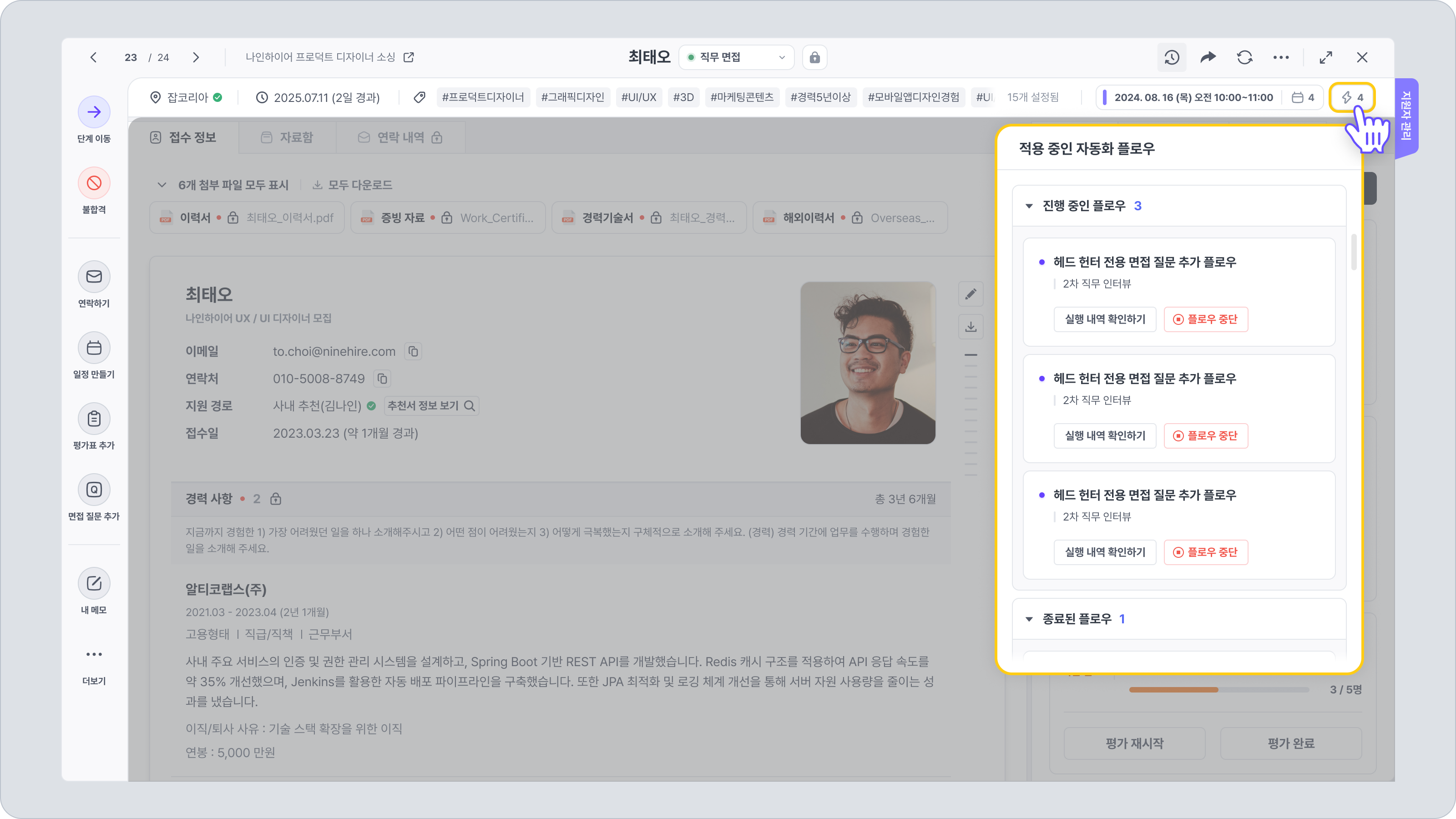 적용된 자동화 플로우가 있는 경우, 지원자 상세 페이지 오른쪽 상단에 번개 모양 자동화 내역 아이콘을 확인할 수 있습니다.