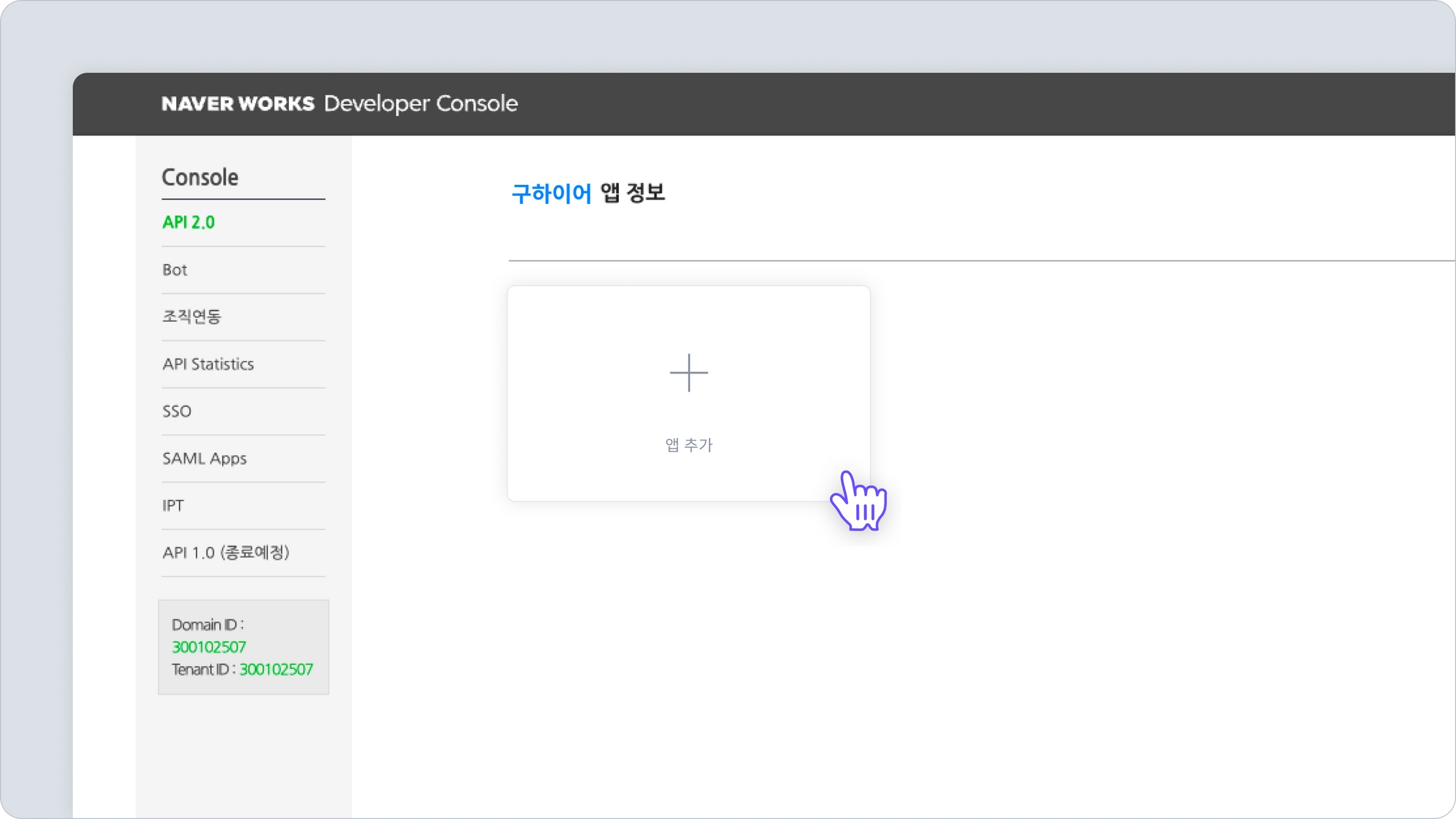 네이버 웍스 개발자 콘솔에 네이버 웍스 관리자 계정으로 로그인해 주세요.