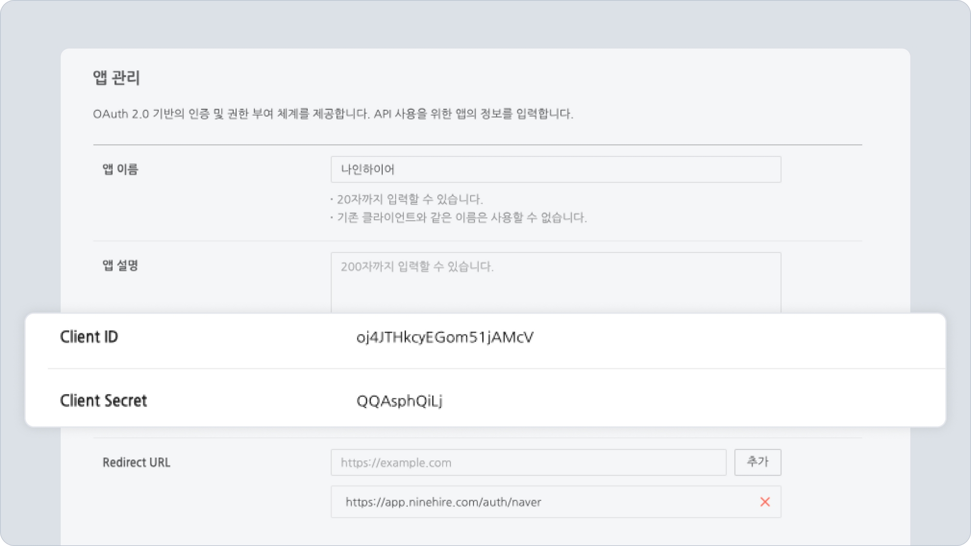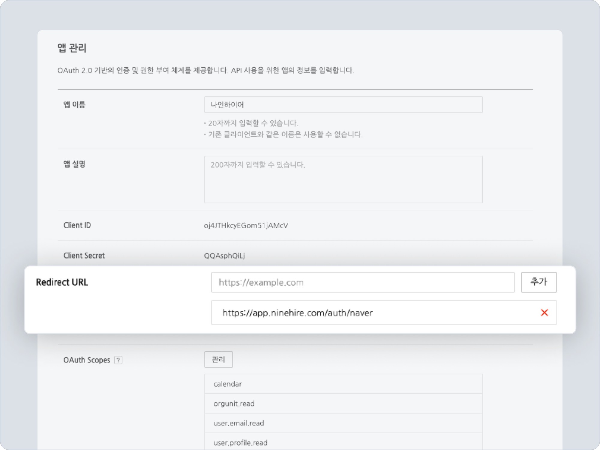 앱 관리 > Redirect URL 에 https://app.ninehire.com/auth/naver 을 입력한 후 추가해 주세요