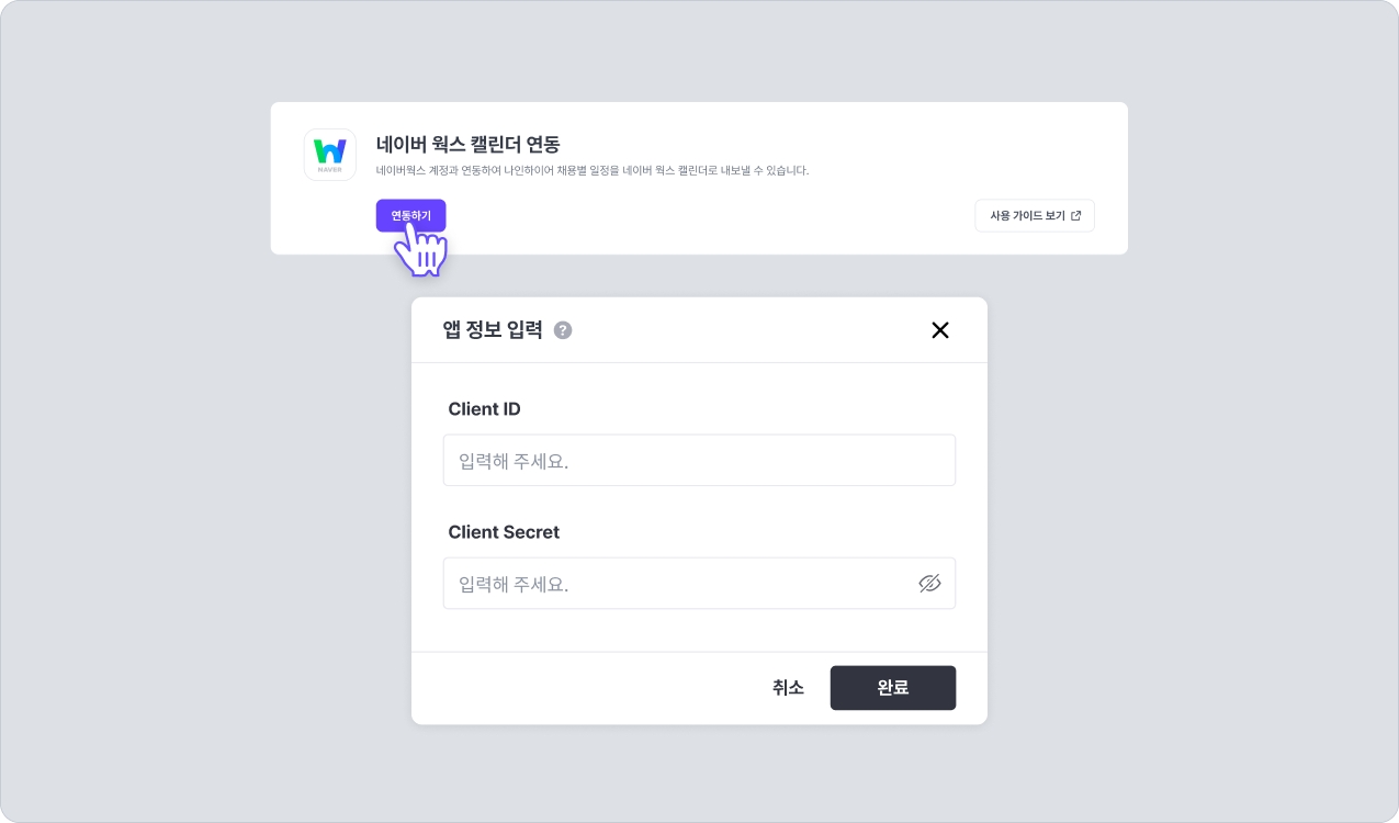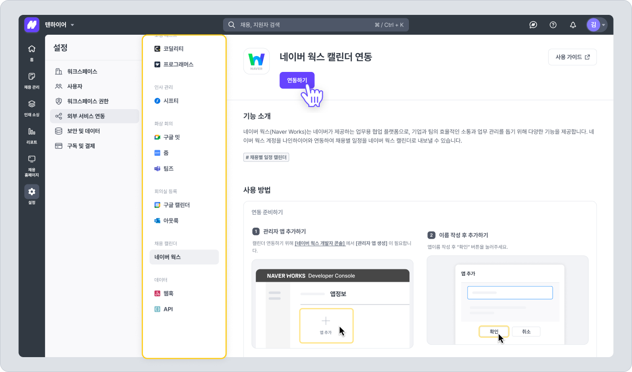 접근 경로 : 설정 > 외부 서비스 연동 > 채용 캘린더 > 네이버 웍스