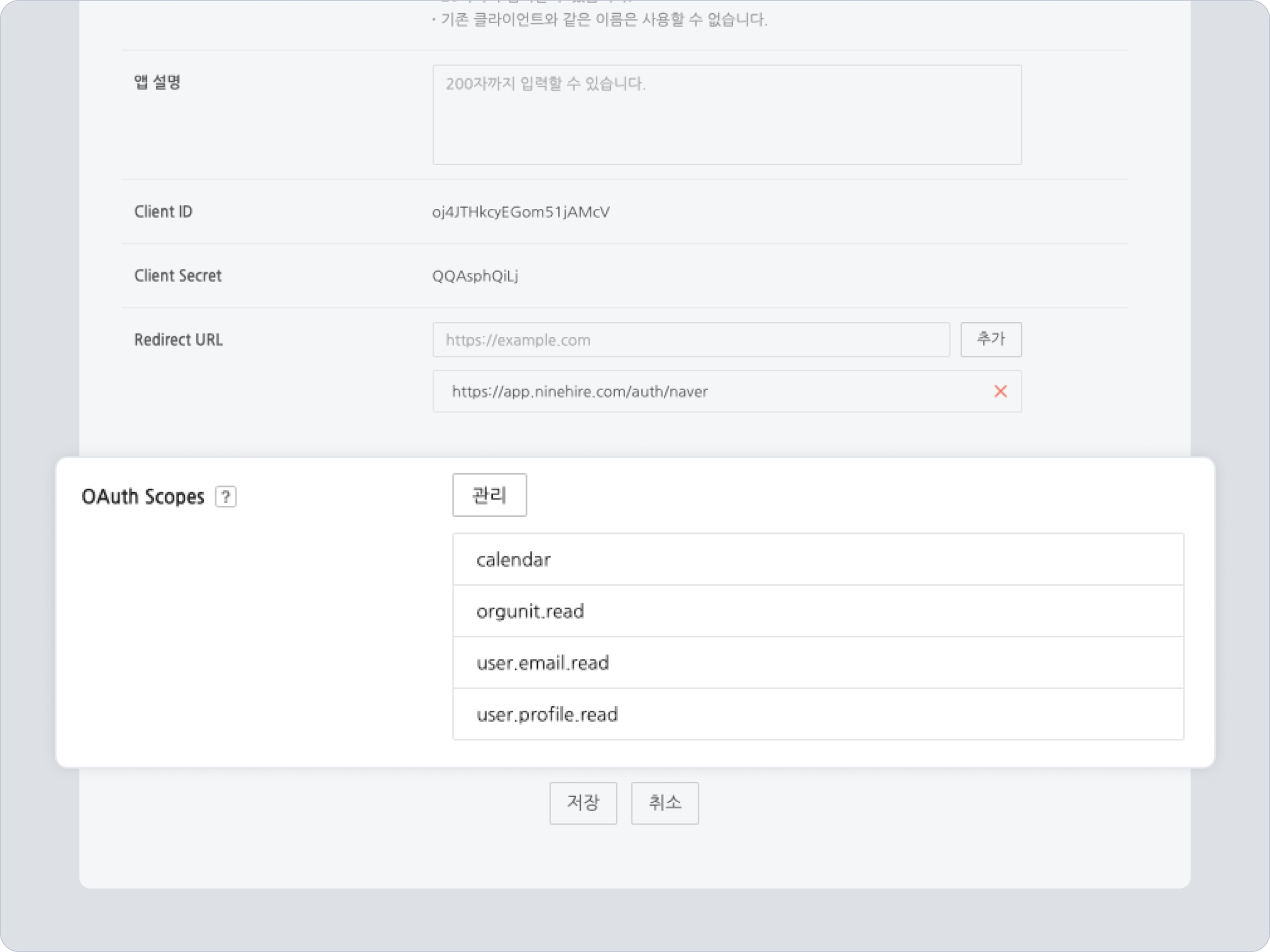 앱 관리 > OAuth Scopes 에서 관리를 클릭하신 후 위 4개(calendar, orgunit.read, user.email.read, user.profile.read) 항목을 선택해 주세요.