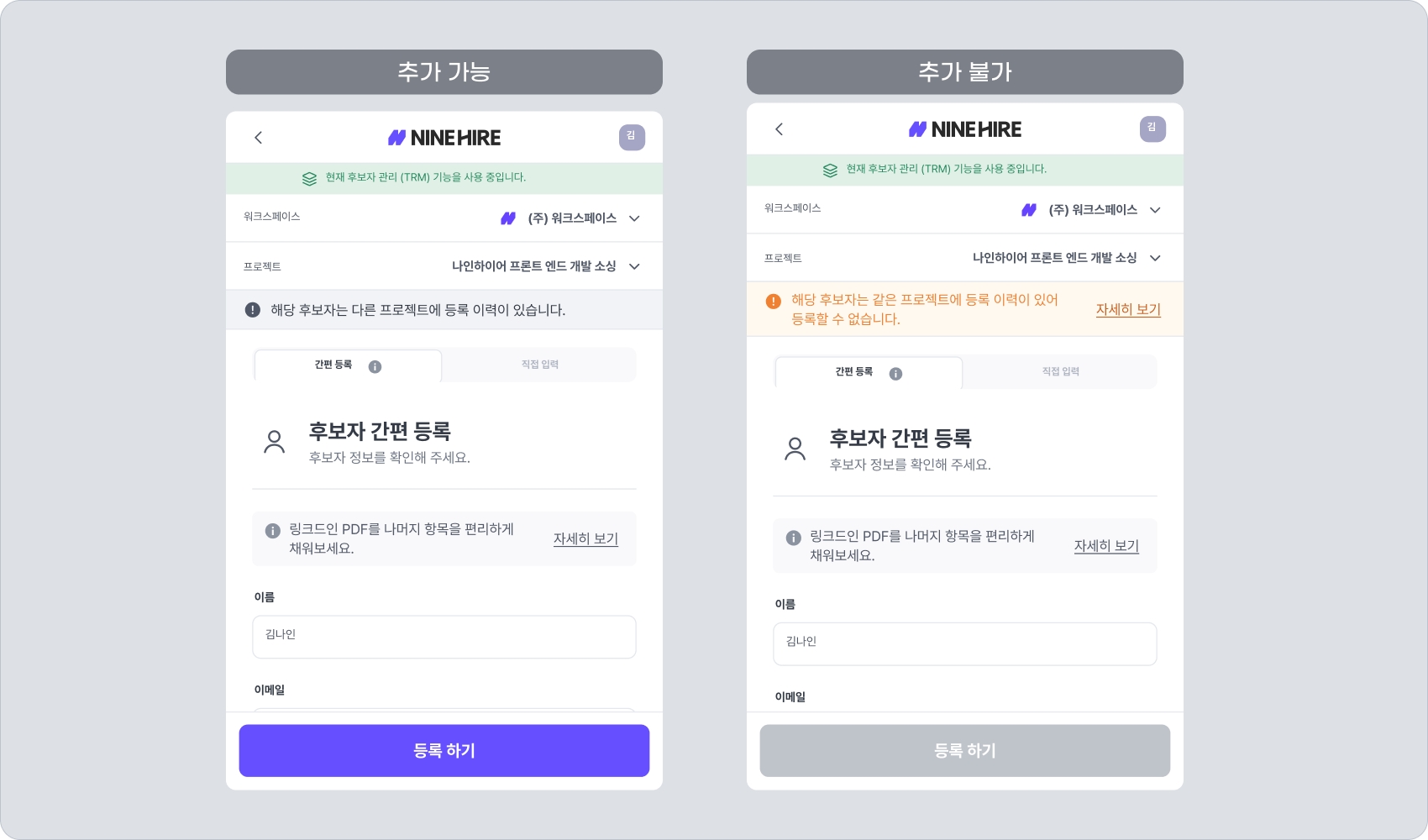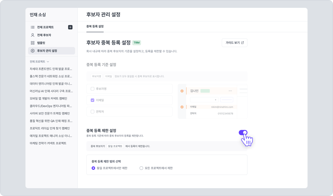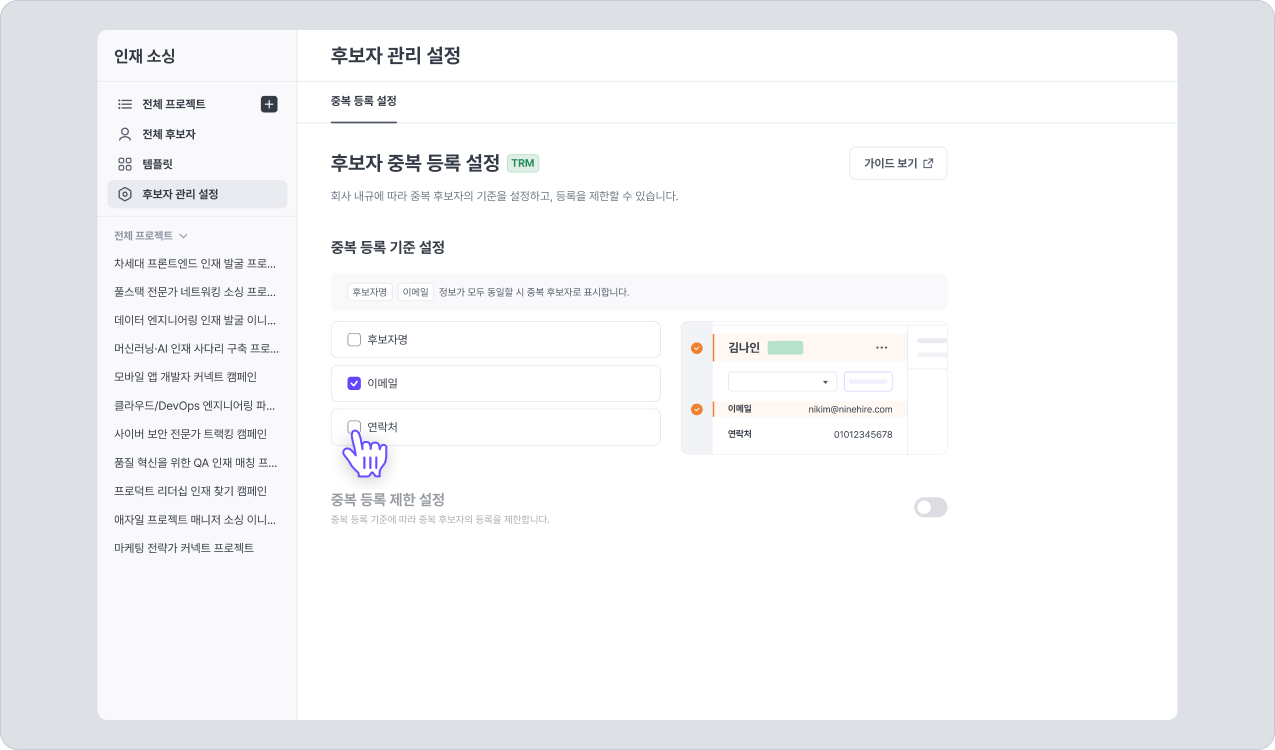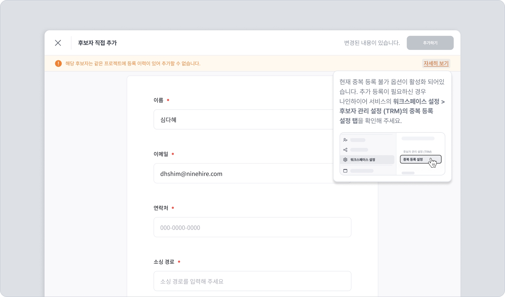 나인하이어 어시스턴트(크롬 확장 프로그램)로 TRM 후보자 추가 시, 중복 등록 제한 설정 옵션 상태에 따라 후보자 추가가 제한될 수 있습니다.