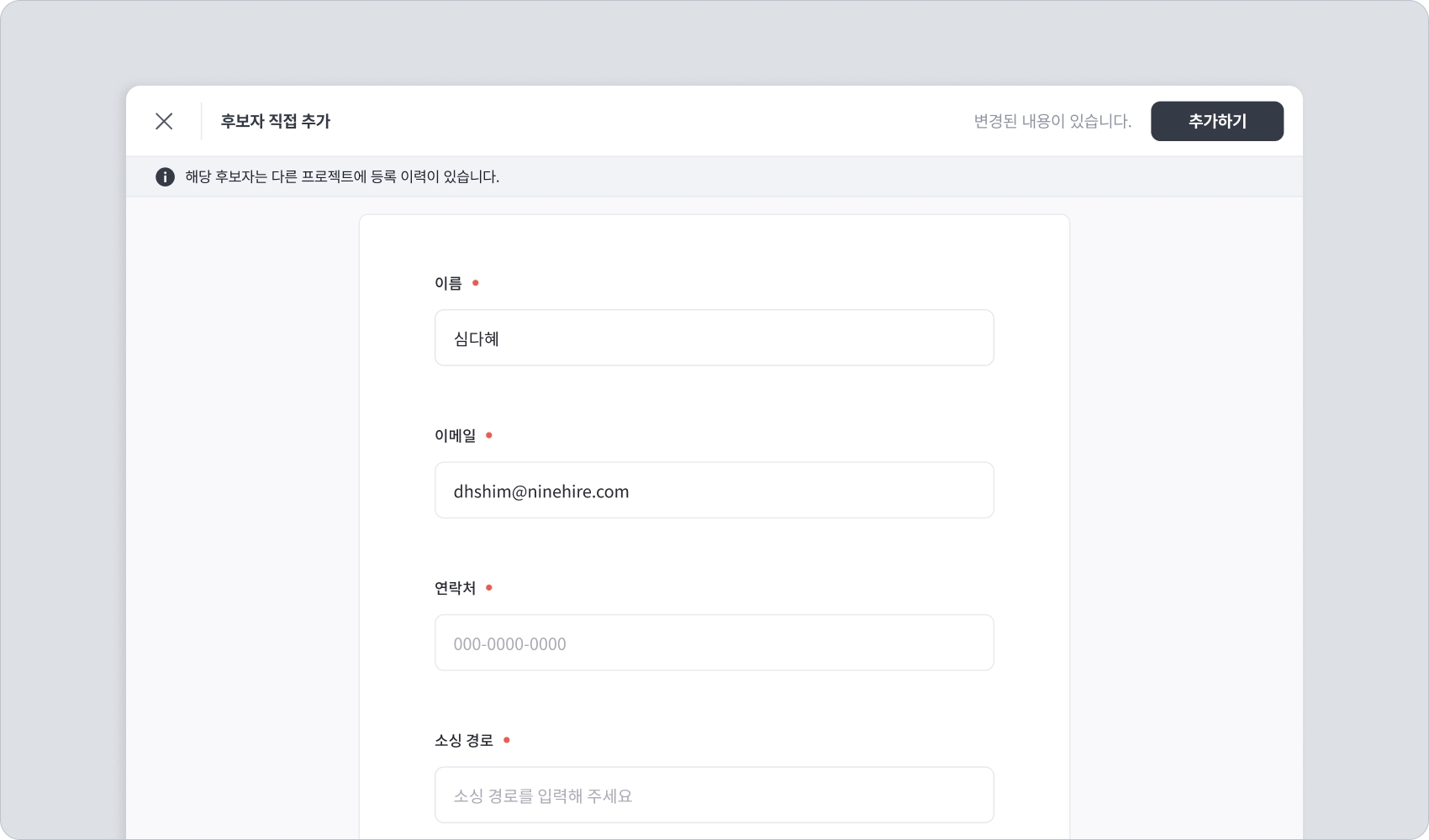중복 등록 기준은 설정했으나 중복 등록 제한 옵션은 설정하지 않은 경우, 같은 정보로 등록한 이력이 있는 후보자 정보를 작성하여 추가하기를 클릭하면 위와 같이 "해당 후보자는 다른 프로젝트에 등록 이력이 있습니다."라는 모달이 표시됩니다.