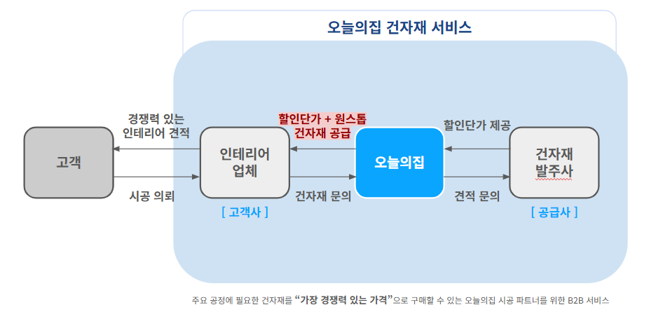 오늘의집 건자재몰은 인테리어 시공에 필요한 건자재를 한 곳에서 간편하게 발주할 수 있는 서비스입니다. 자재 단가 협상과 품질 관리는 건자재몰이 맡겠습니다. 대표님은 고객 상담에 집중해 주세요.
