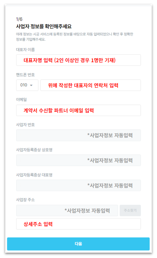 파트너 정보 (사업자명, 사업자번호 등) 필수 기재