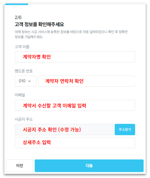고객 정보 (고객명, 연락처, 시공지 주소 등) 필수 기재