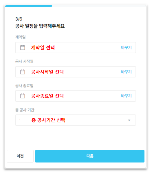 첨부할 견적서/계약서상 의 공사일정과 동일하게 입력해 주세요.