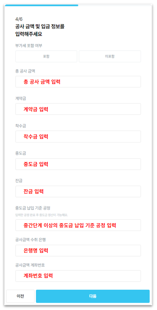 중도금이 없는 경우 중도금 납입 기준 공정에 ‘없음’으로 작성해 주세요.
