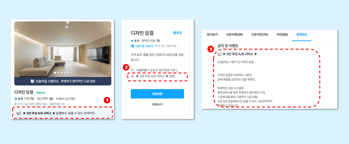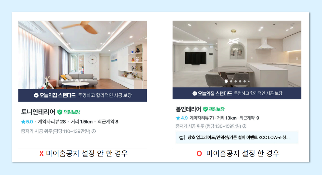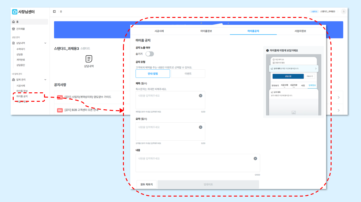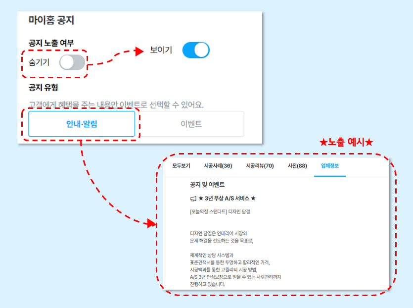 오늘의집 홈페이지에서는 마이홈 공지 기능을 통해 우리 업체 소식을 홍보할 수 있습니다.