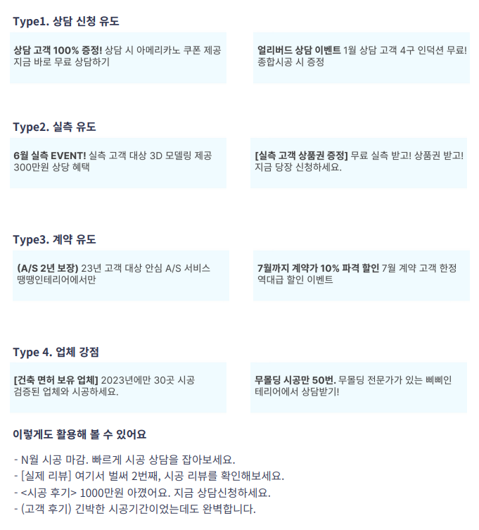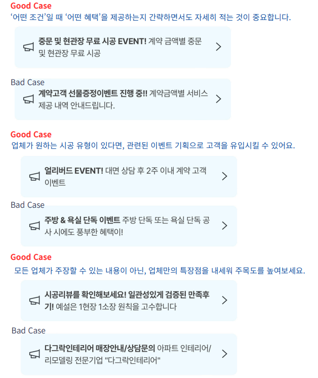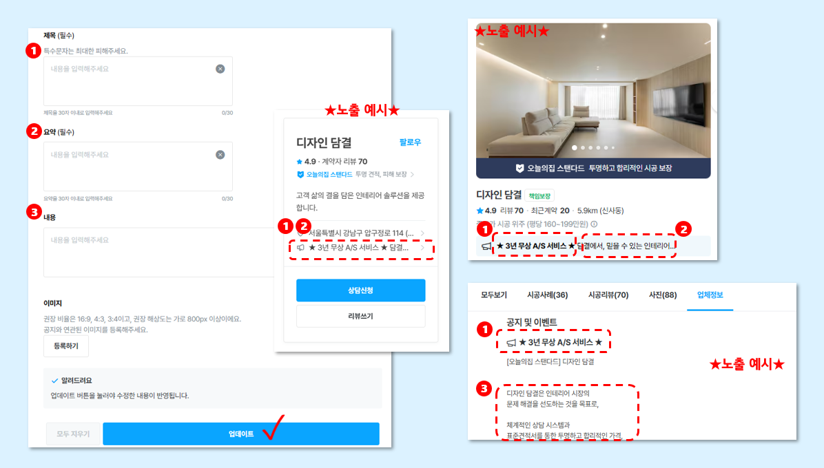 유료 광고 업체만 사용가능한 서비스로, 우리 업체만의 특장점을 소개하거나 이벤트/프로모션 등의 홍보, 공지사항 등 다양한 콘텐츠를 등록할 수 있습니다.