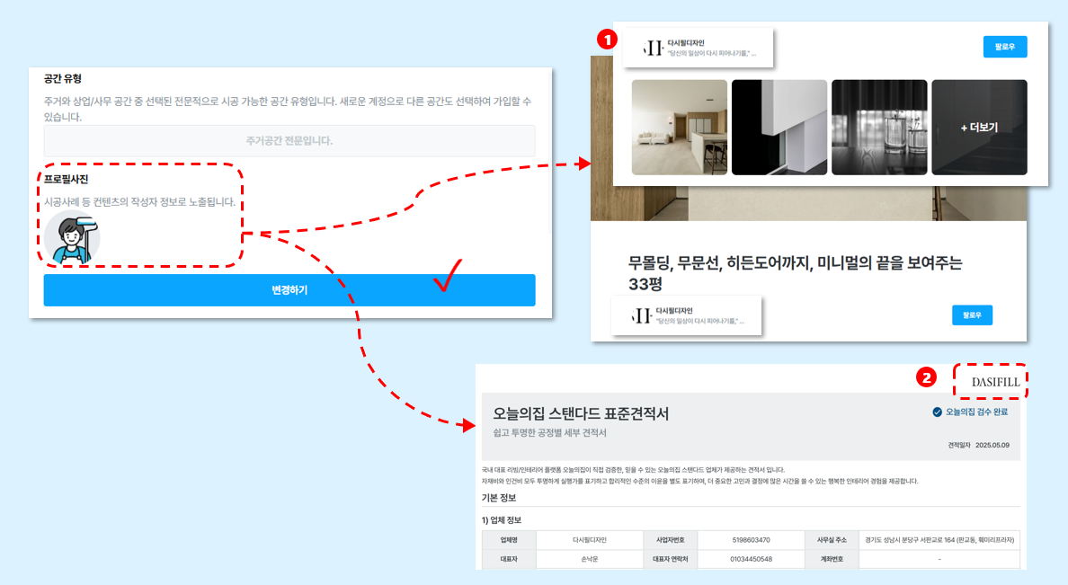 ① 오늘의집 홈페이지 상 시공사례 등 컨텐츠의 작성자 정보로 노출됩니다.
