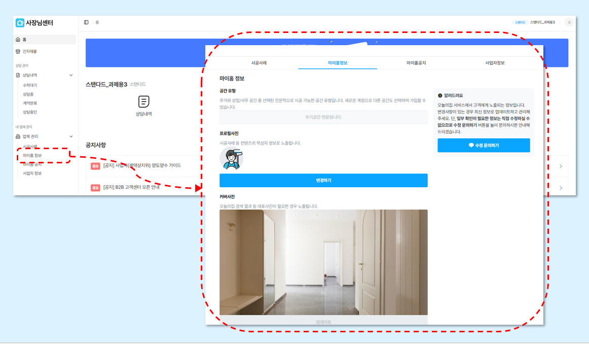 마이홈정보 에서는 오늘의집 홈페이지에서(=고객에게) 노출되는 회사의 정보를 수정 및 관리할 수 있습니다.