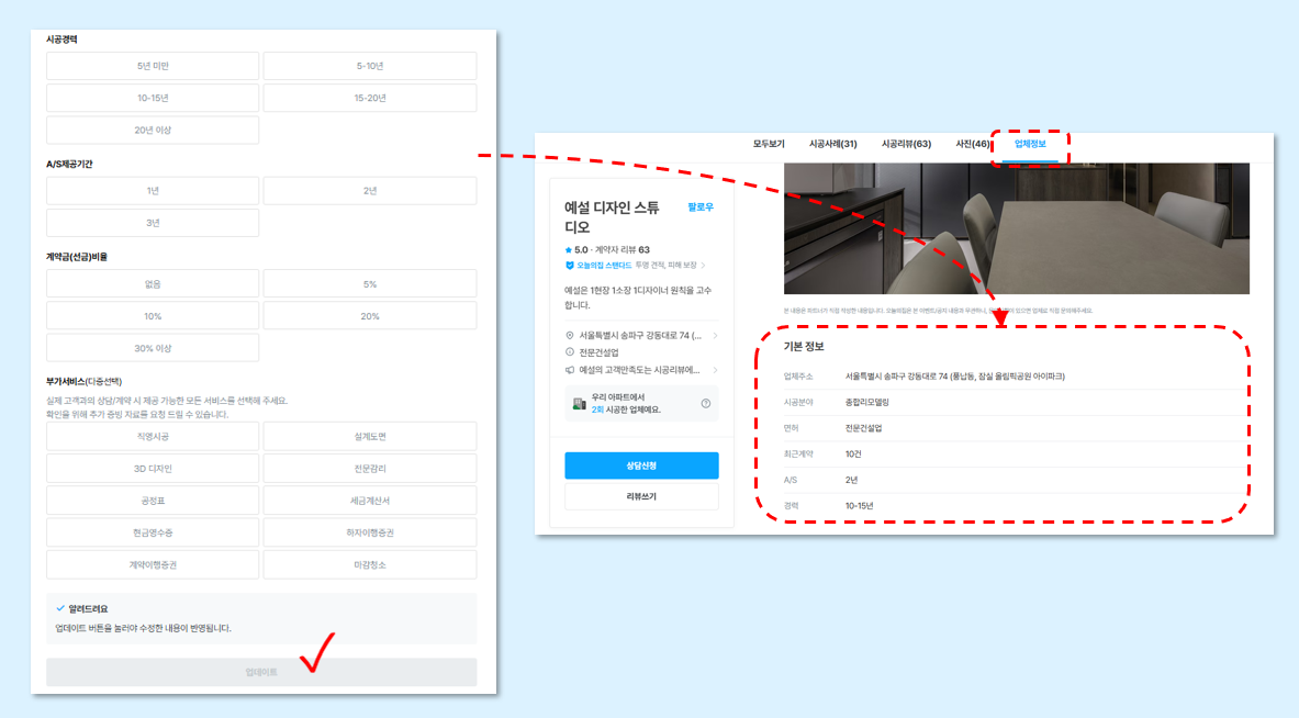 주거 or 상업 시공 중 선택하여 노출되는 시공 정보로 오늘의집 인테리어 시공 파트너사의 경우 주거 공간으로 고정되어 있습니다.