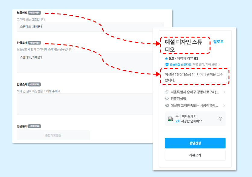 오늘의집 홈페이지에서 노출되는 나의 프로필 대표 상호입니다.