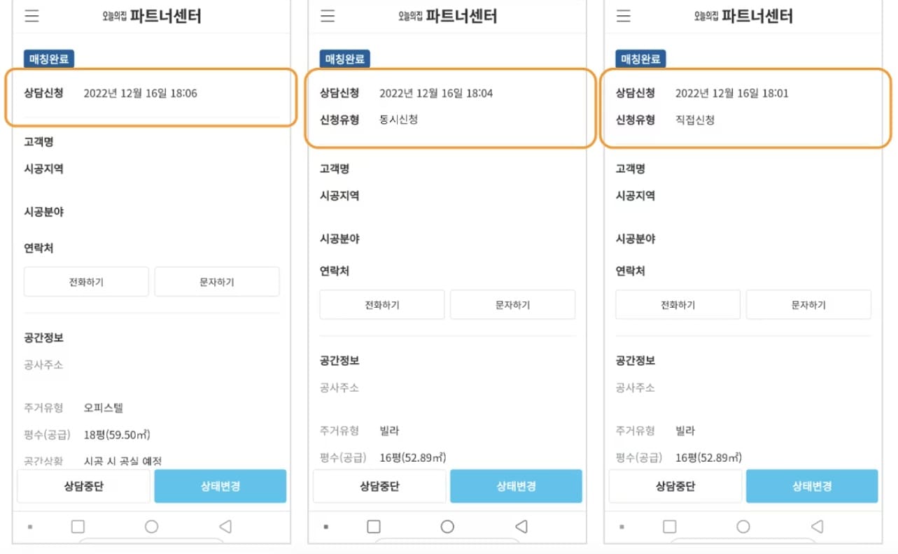 ① 미표기 : 간편상담으로 신청하여 매칭된 고객 / ② 동시신청 : 타업체에 직접 상담신청을 하면서 다른업체 상담도 받아보고 싶다고 희망하신 고객 / ③ 직접신청 : 파트너님 업체에 직접 상담 신청을 넣은객