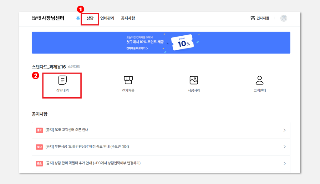 홈 화면에서 상단 탭 가운데 ①[상담]을 클릭하거나 ②[상담내역]을 클릭하면 진입 가능합니다.