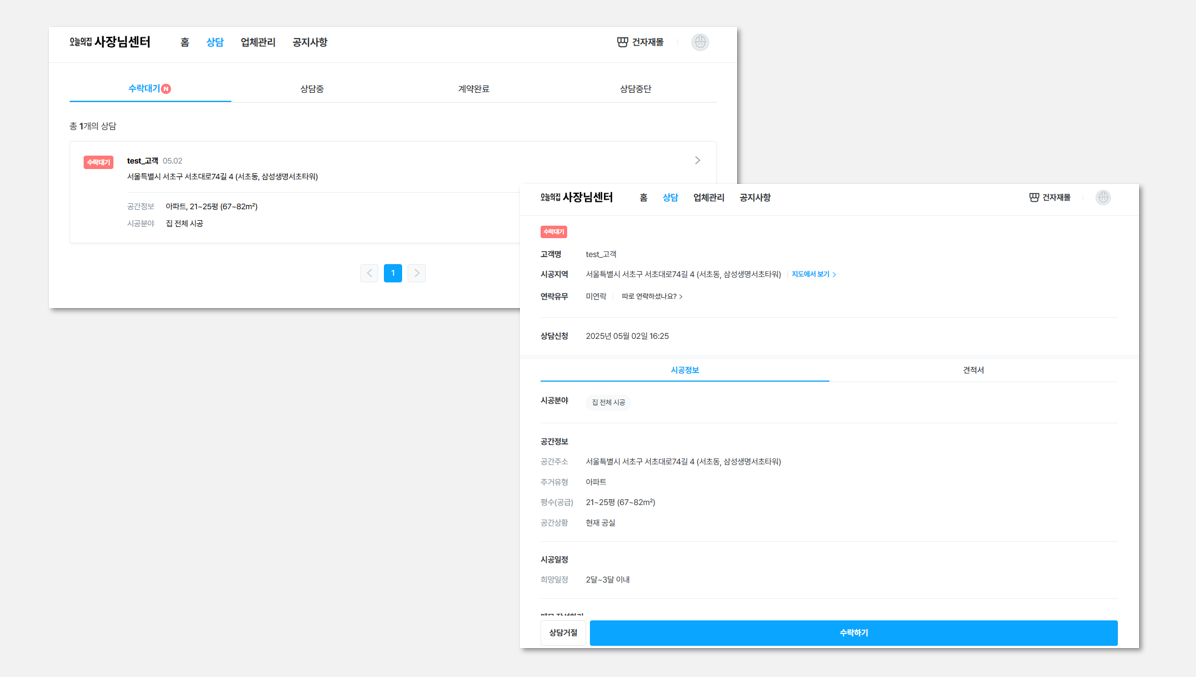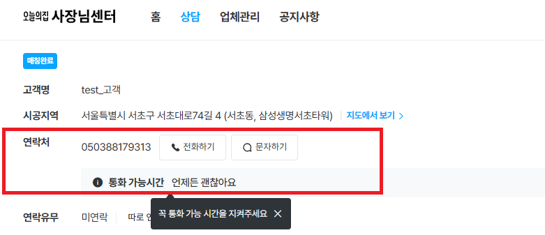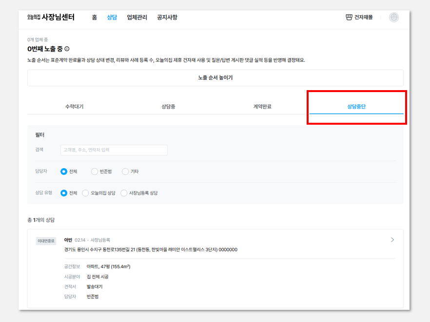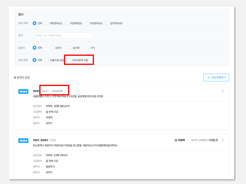 상담유형에서 [사장님등록 상담]을 통해 직접 등록한 오더만 필터링해서 확인도 가능합니다.