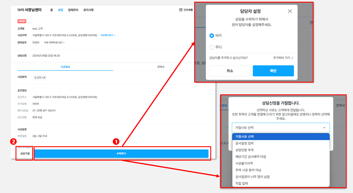 특정 사유에 따라 해당 상담을 거절하고자 하는 경우, [상담거절] 버튼을 클릭해서 상담거절이 가능하며 상담 거절하는 사유를 선택 후 [확인] 버튼을 클릭합니다.