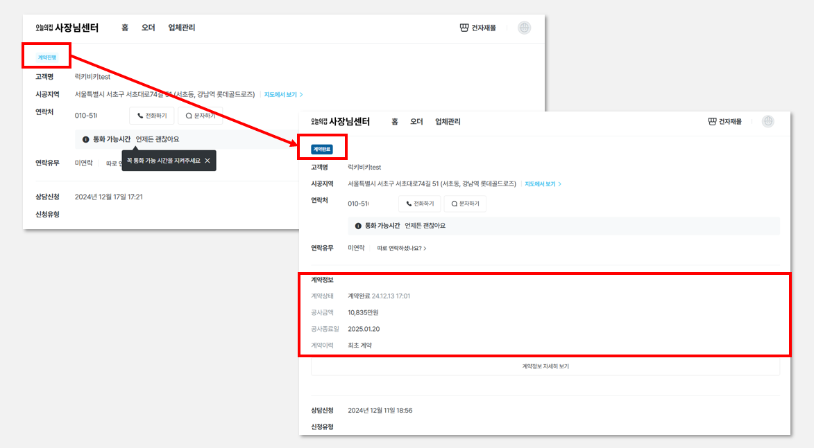 계약완료상태값으로 넘어갑니다.계약완료 이후 계약정보가 하단에 노출됩니다.