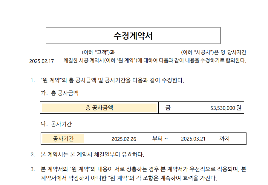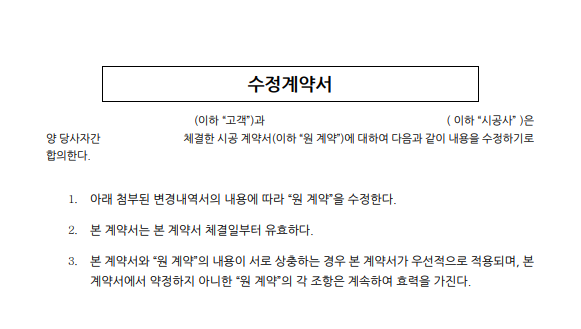 정의 : 수정계약서 (구 변경합의서) 는 공사중에 발생한 변경사항에 대해 법적 효력을 뒷받침하도록 고객과 파트너사가 체결한 계약서 입니다.