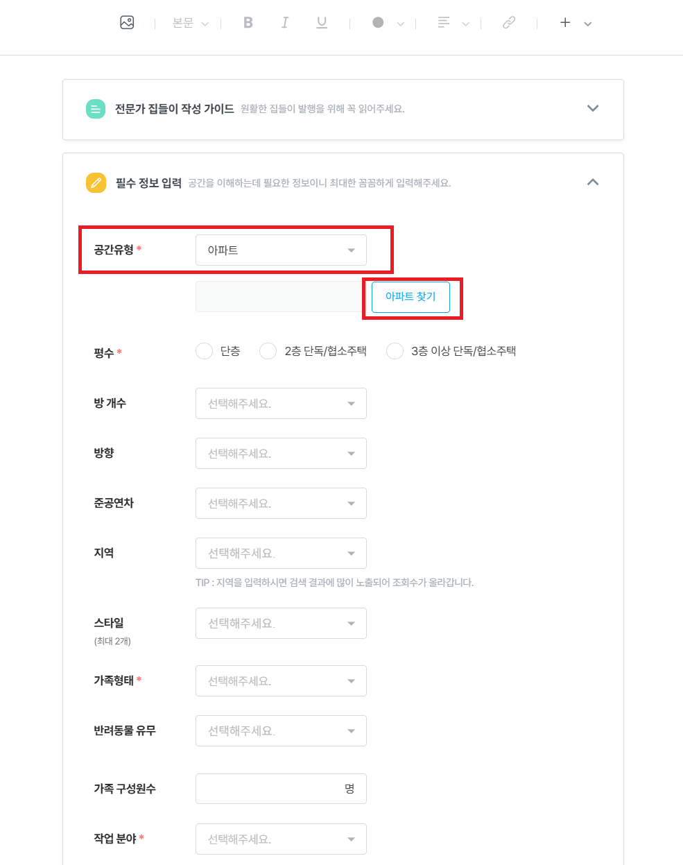단, 공간유형이 [아파트]로 선택이 되어야하며 아파트 찾기를 통해 맞는 아파트를 선택 · 등록해주세요.