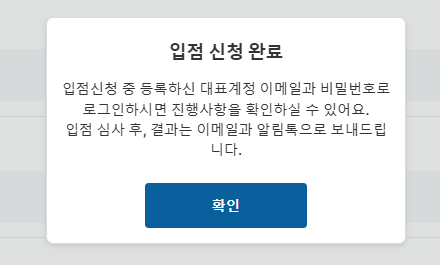 입점신청 후 완료 시 팝업창 내 [확인] 버튼 클릭합니다.