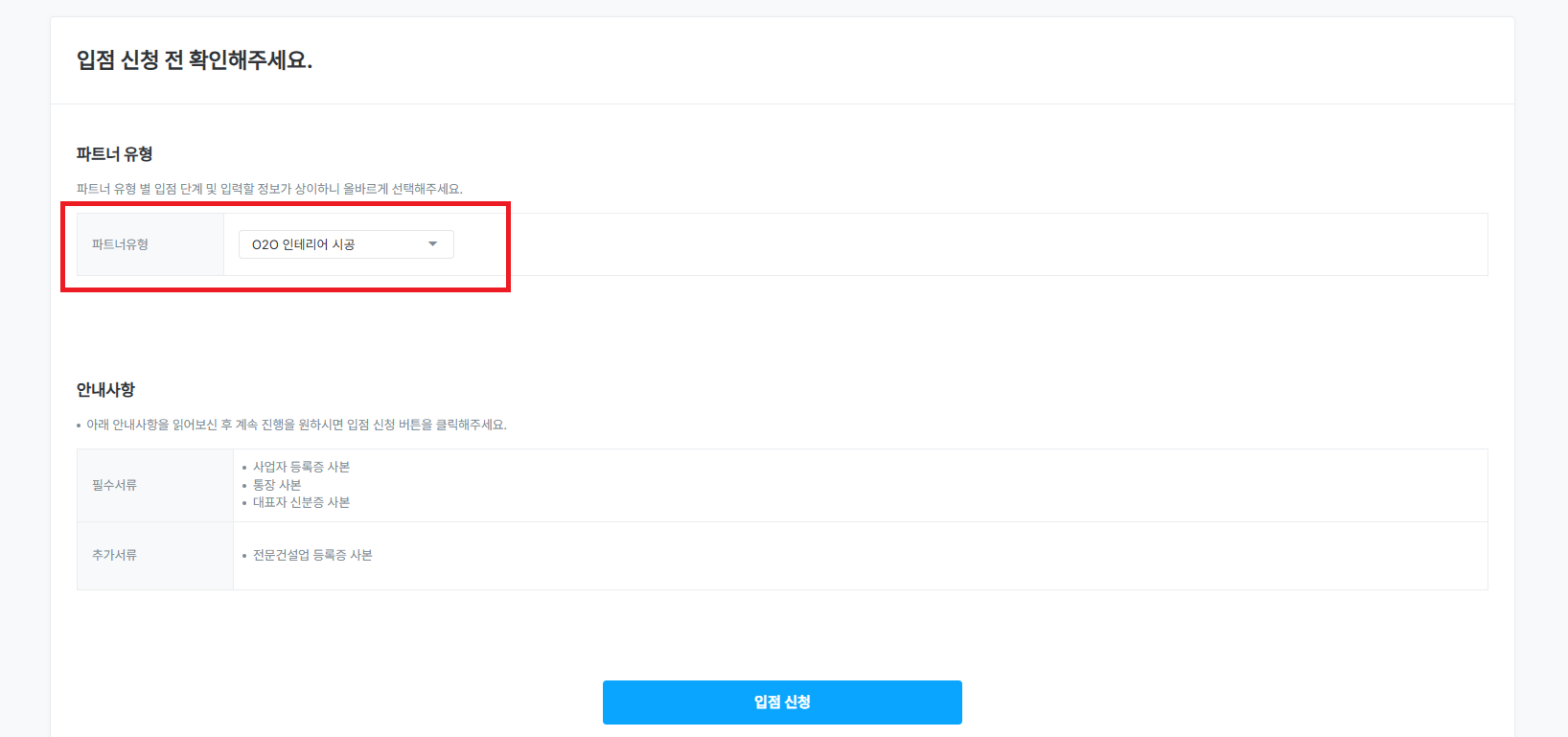 파트너 유형은 [O2O 인테리어 시공] 을 클릭해야 합니다.