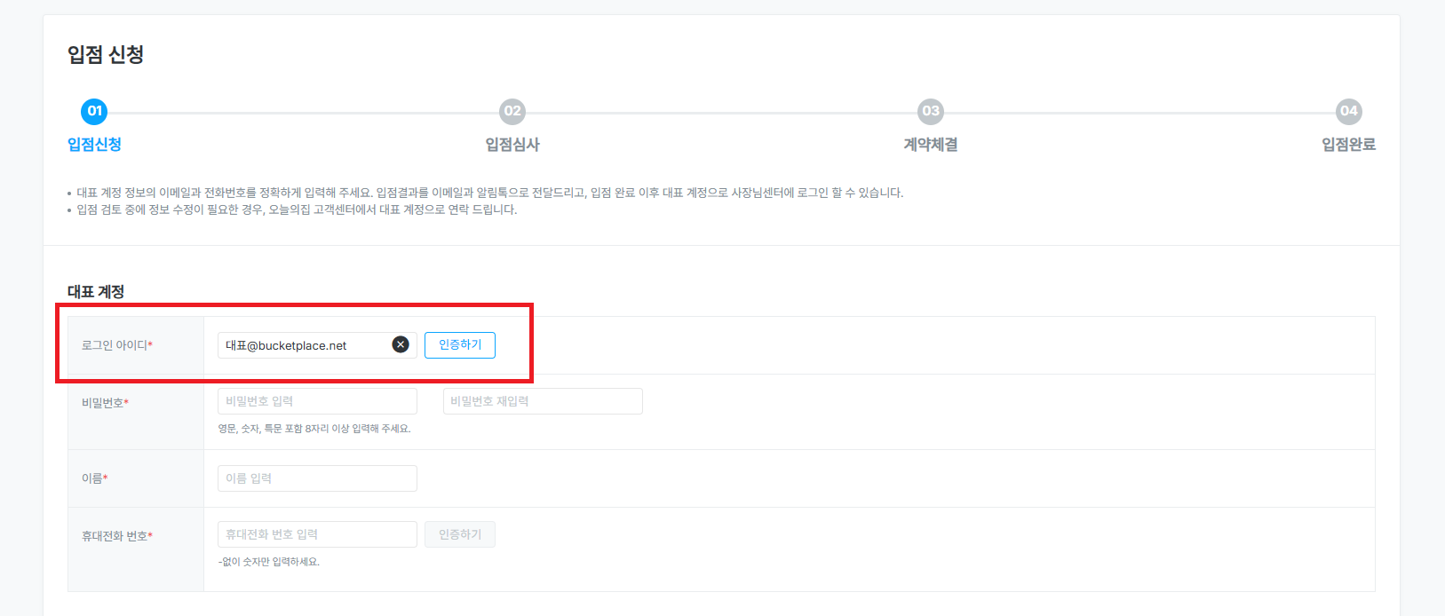 대표 계정의 경우, 가입 완료 후 아이디 변경이 불가하고 입점 검토 중 정보 수정이 필요한 경우 연락하기 위한 수단으로 사용됩니다.