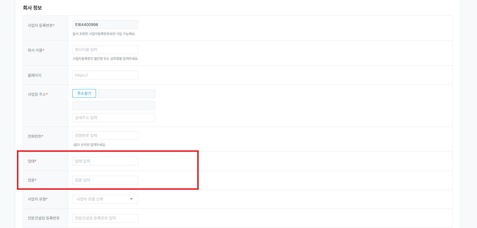 전문건설업이 있는 경우, 등록번호를 작성합니다.