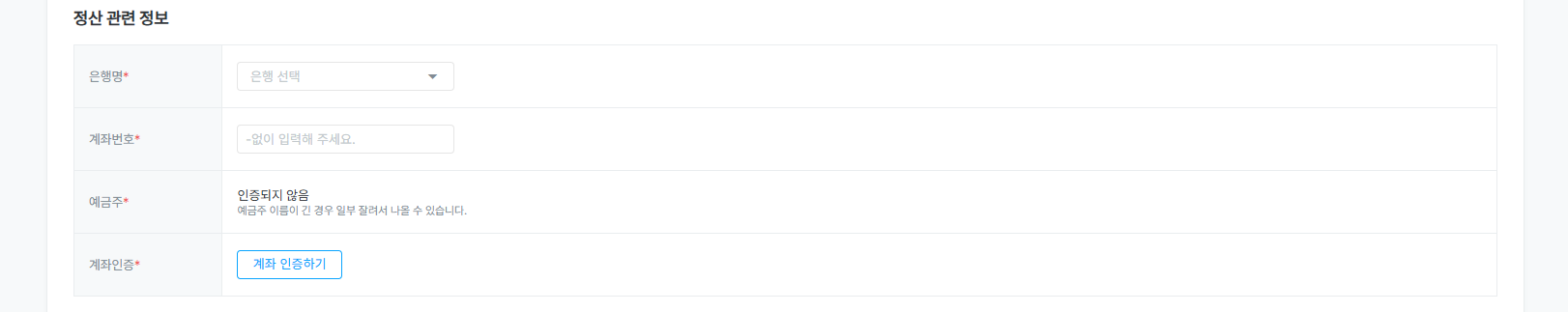 은행명 / 계좌번호 / 예금주 : 정산시 사용하는 계좌이며 건자재 관련 환불 시 등 활용됩니다.