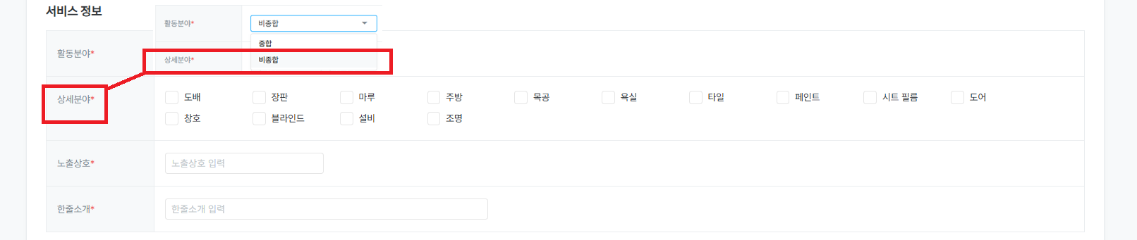 비종합 : 인테리어 개별 시공 서비스 제공 (예 : 도배, 창호, 마루, 장판 등) 시 선택합니다.