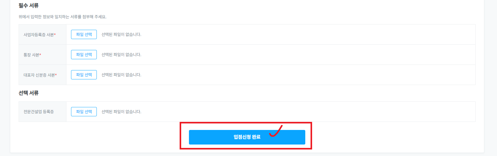 사업자등록증 사본, 통장 사본, 대표자 신분증 사본, 전문건설업 등록증(선택) 순서대로 업로드합니다.