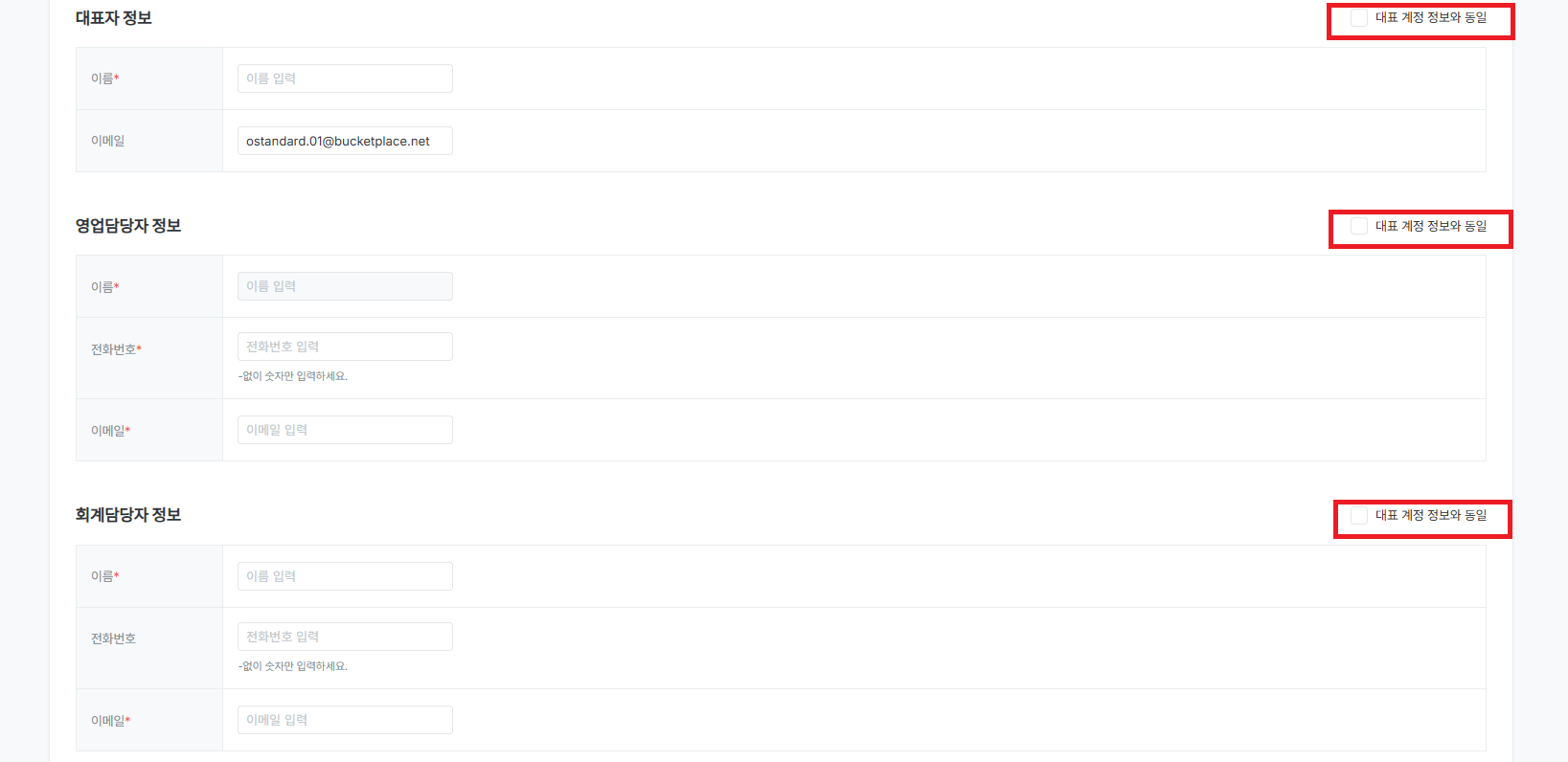 [대표 계정 정보와 동일] 클릭 시 대표 정보 그대로 연동합니다.