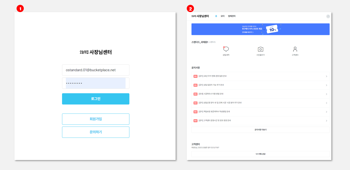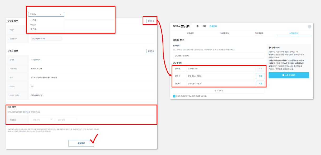 [수정하기] 를 클릭하면, 업체관리 > 사업자 정보 메뉴로 이동하여, 고객 상담을 담당할 담당자 이름과 전화번호를 일괄 등록할 수 있습니다.