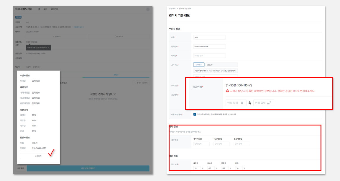 공급면적의 경우, 시공예정지 공급면적은 고객이 상담 시 등록한 임의 정보이기 때문에 상담 후 정확한 공급면적 수정이 필요합니다.
