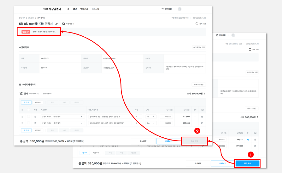 운영자의 검수가 완료되어 모든 항목에 적합 표시가 되면, 고객님께 견적서 발송이 가능하다는 상태가 노출
