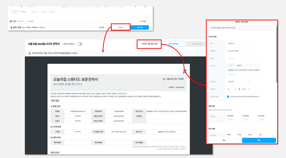 파트너사가 직접 등록한 오더의 경우, 고객이 오늘의집으로 직접 신청한 경우가 아니기 때문에 [견적서 발송하기] 버튼이 노출되지 않습니다. [미리보기] 버튼을 통해 PDF 다운로드 로 견적서를 직접 전달 가능합니다.