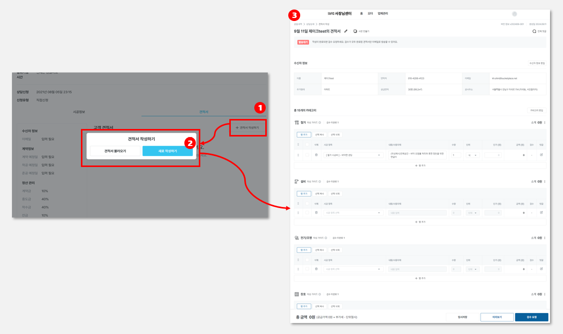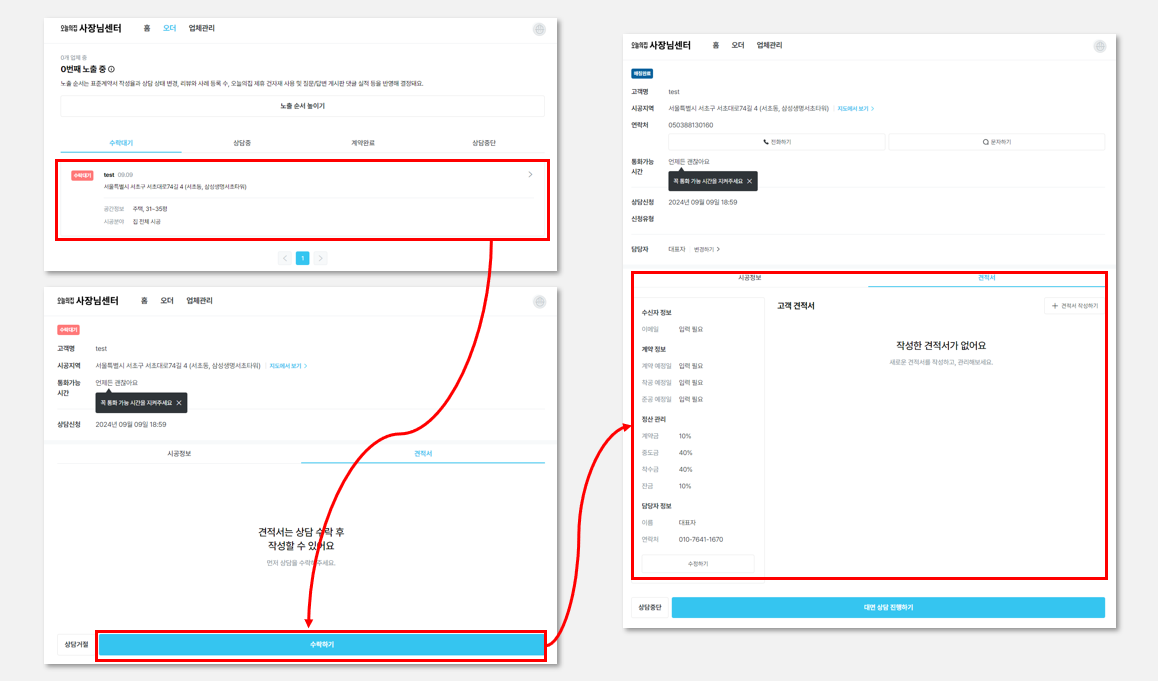 상담 수락 후 견적서 작성 화면 노출 (상담대기 상태에서는 불가) 됩니다.